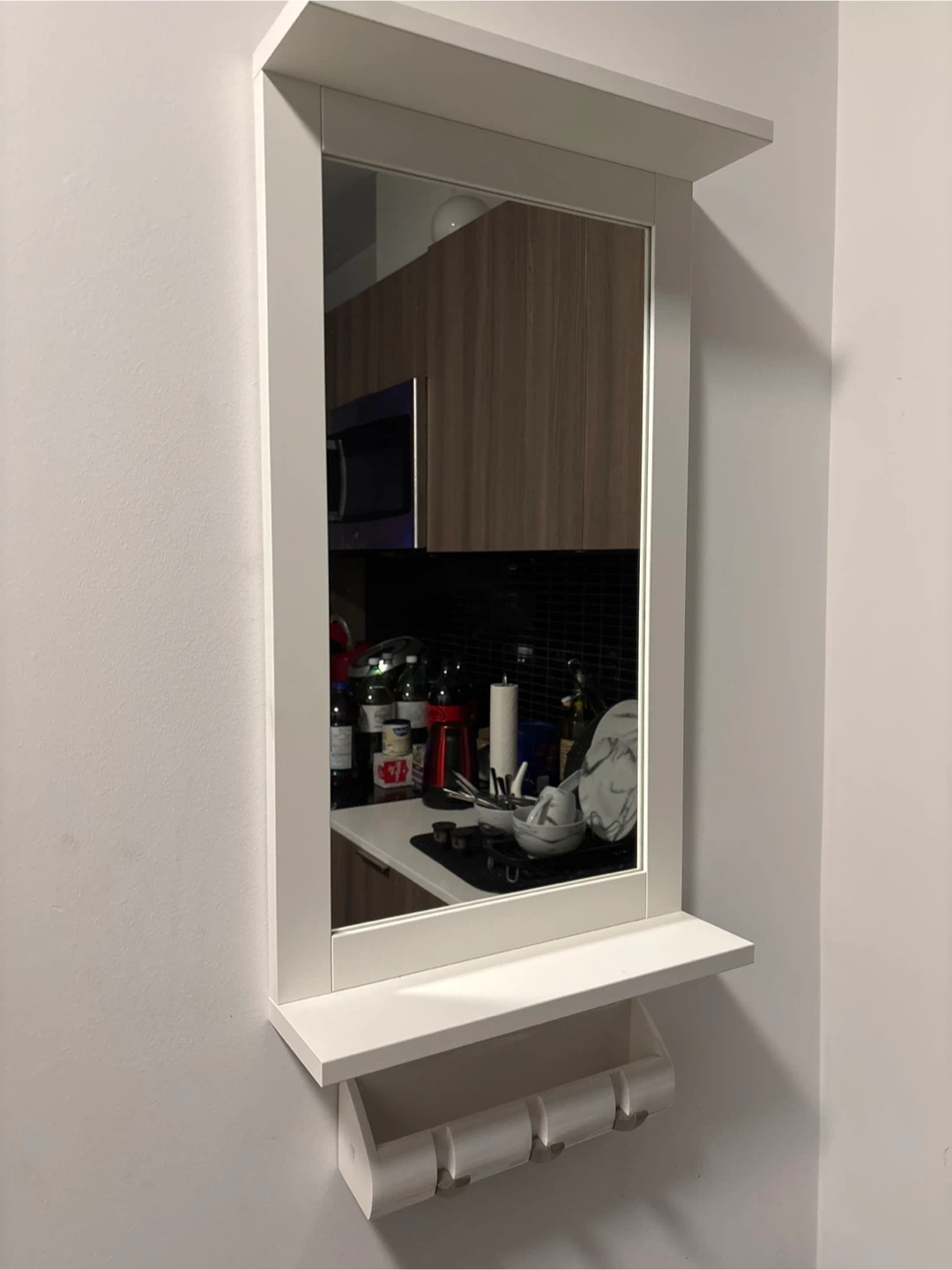 This is a white wall-mounted mirror with a small shelf above it. It's great for an entryway or hallway. White wood construction.