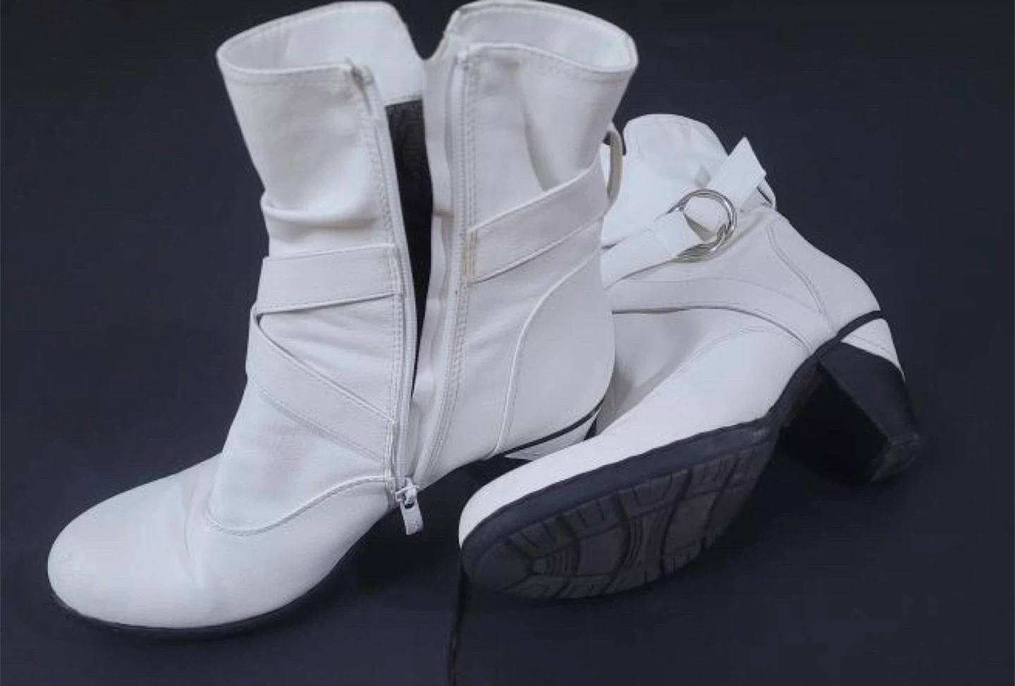 These white ankle boots feature a side zipper and decorative buckle straps. They have a block heel for a bit of height. Man-made material.