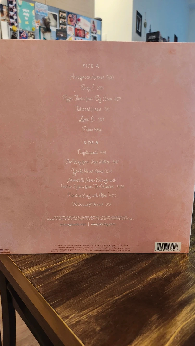 Ariana Grande's debut studio album, 'Yours Truly', on vinyl record. Features tracks like 'The Way' and 'Baby I'. Includes original sleeve.