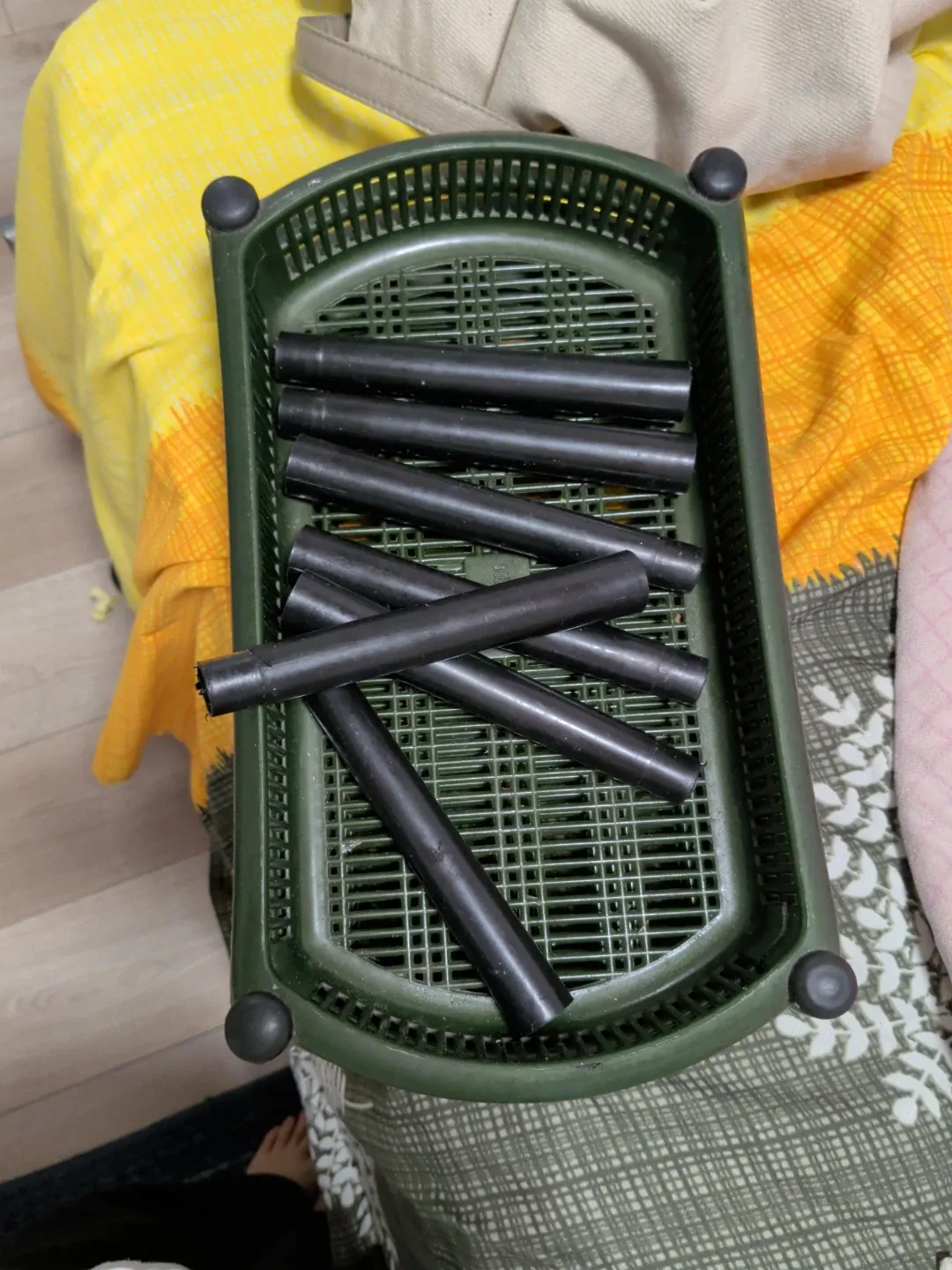 This is a set of seven black plastic tubes. They appear to be hollow and are cylindrical in shape. Great for crafts or DIY projects!