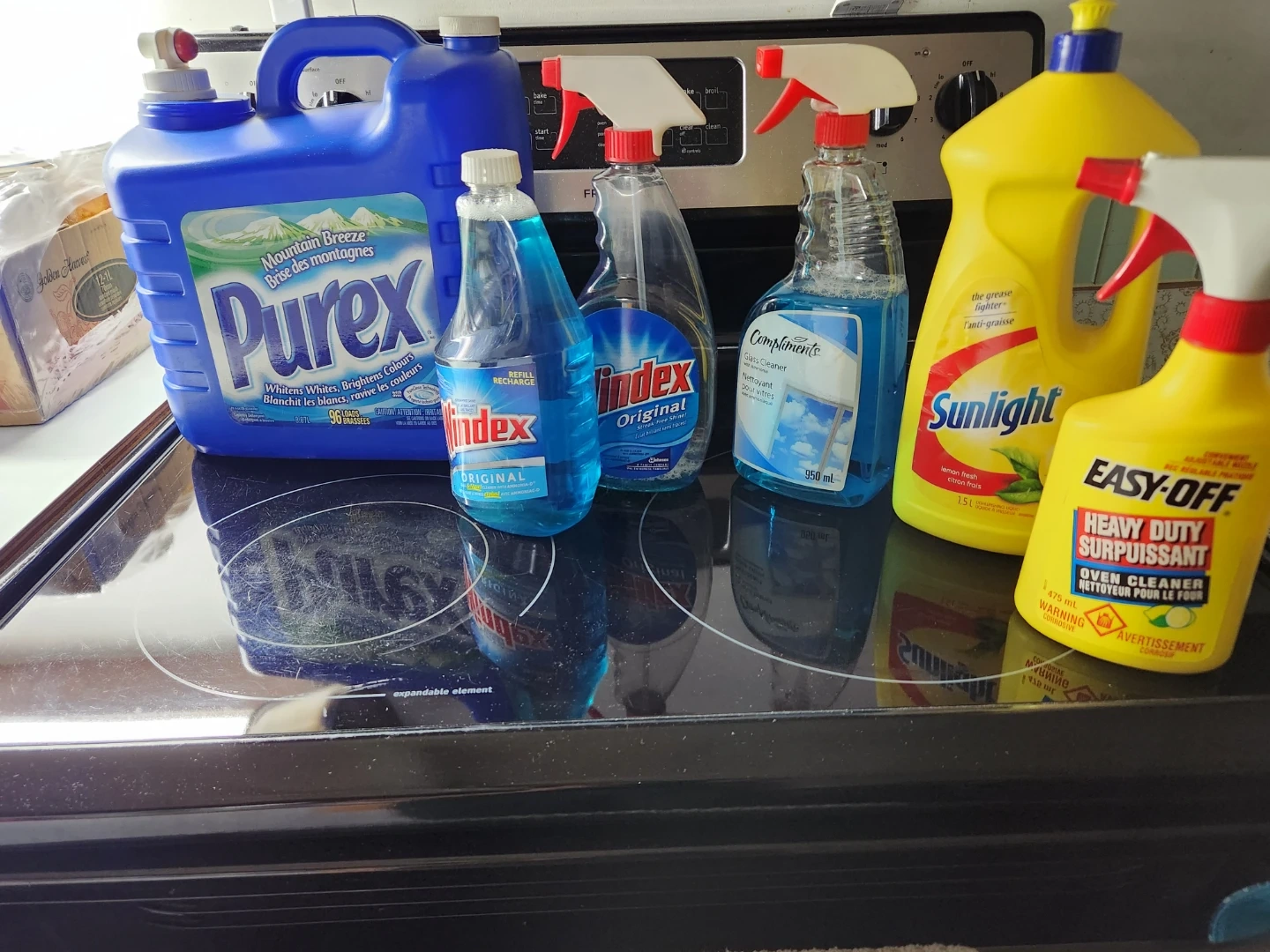 Collection of cleaning supplies including Purex laundry detergent, Windex original cleaner, Compliments glass cleaner, Sunlight dish soap, and Easy-Off oven cleaner. Sizes range from 475 mL to 1.5 L for dish soap.