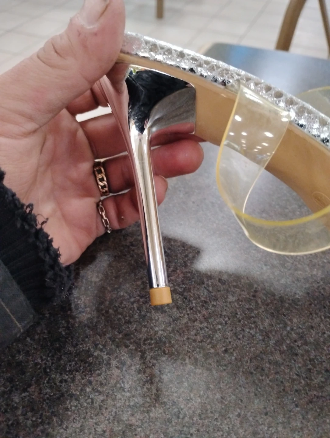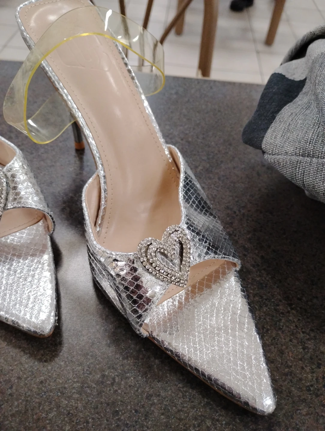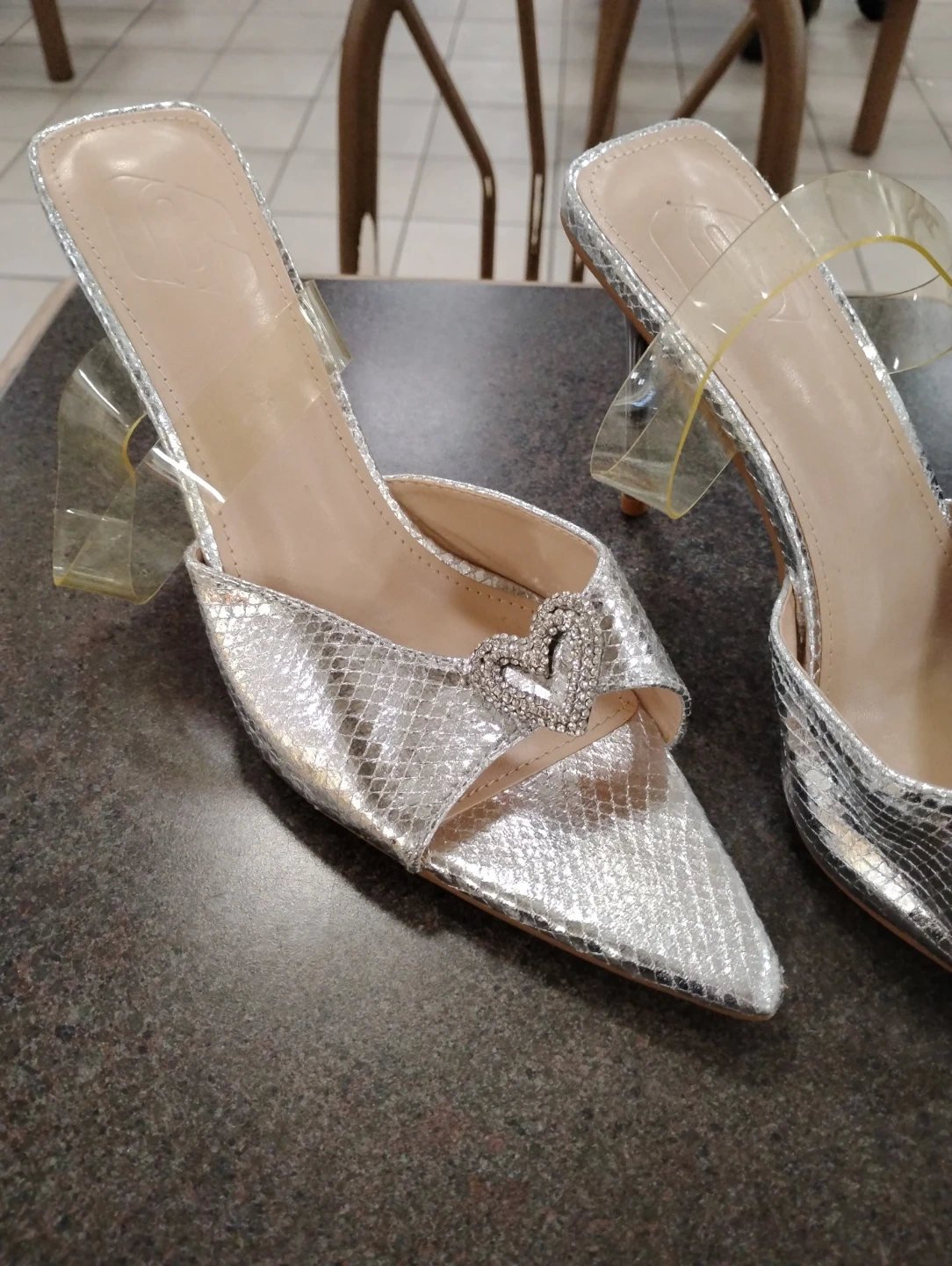 Stylish silver mules with a snake print texture and a sparkly heart embellishment at the vamp. These heels feature a clear strap across the ankle for added security. They're perfect for adding a touch of glamour to any outfit!