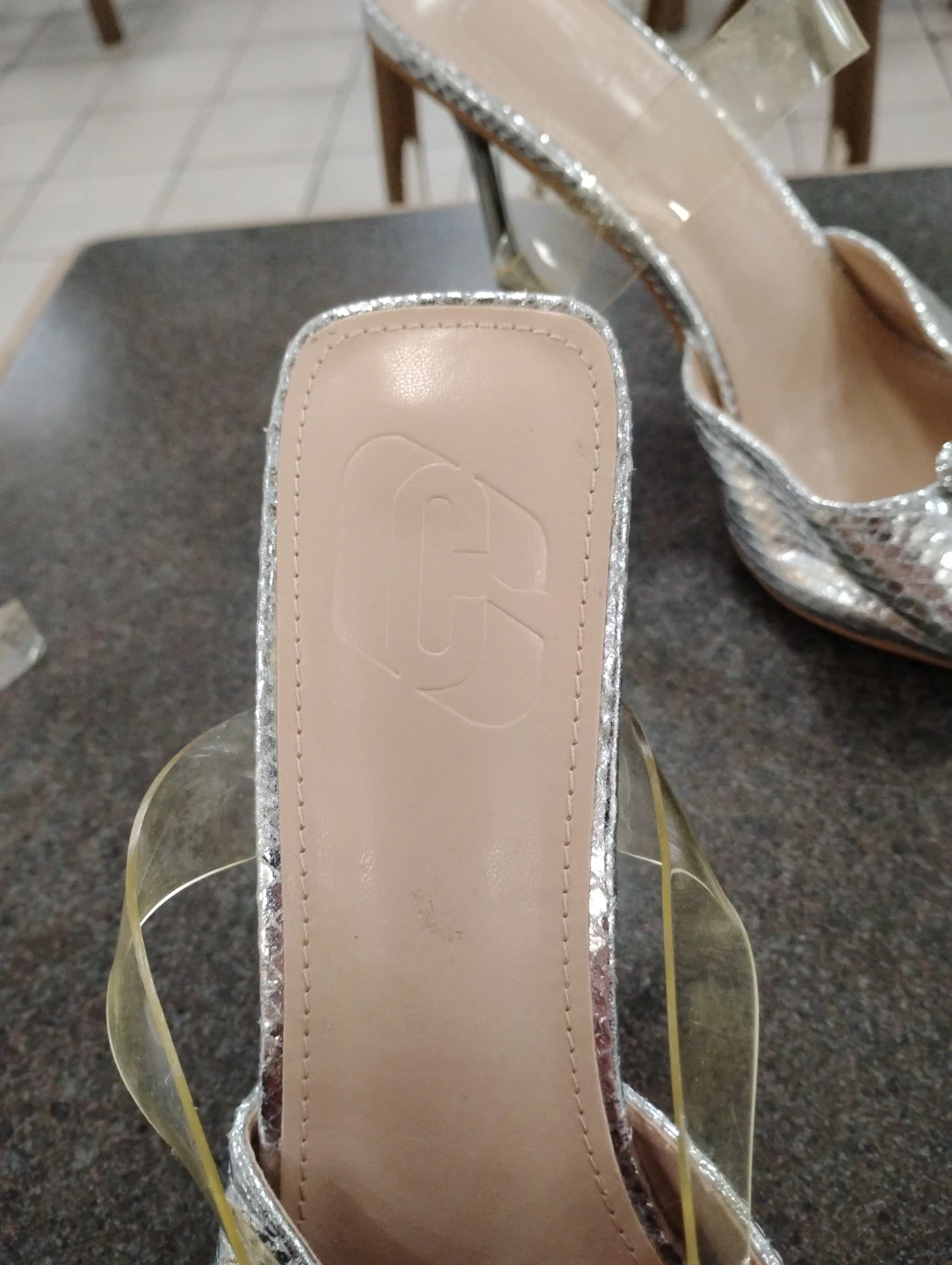 Stylish silver mules with a snake print texture and a sparkly heart embellishment at the vamp. These heels feature a clear strap across the ankle for added security. They're perfect for adding a touch of glamour to any outfit!