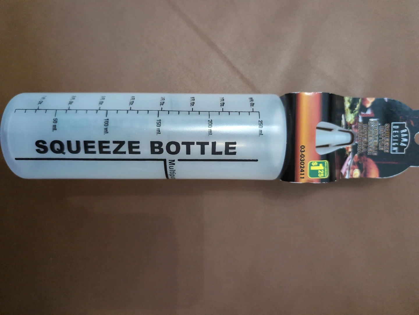 Rama Design squeeze bottle. It holds 250ml. Measurements are in both ml and fl. oz. This bottle is multipurpose. It's useful for dispensing various liquids.