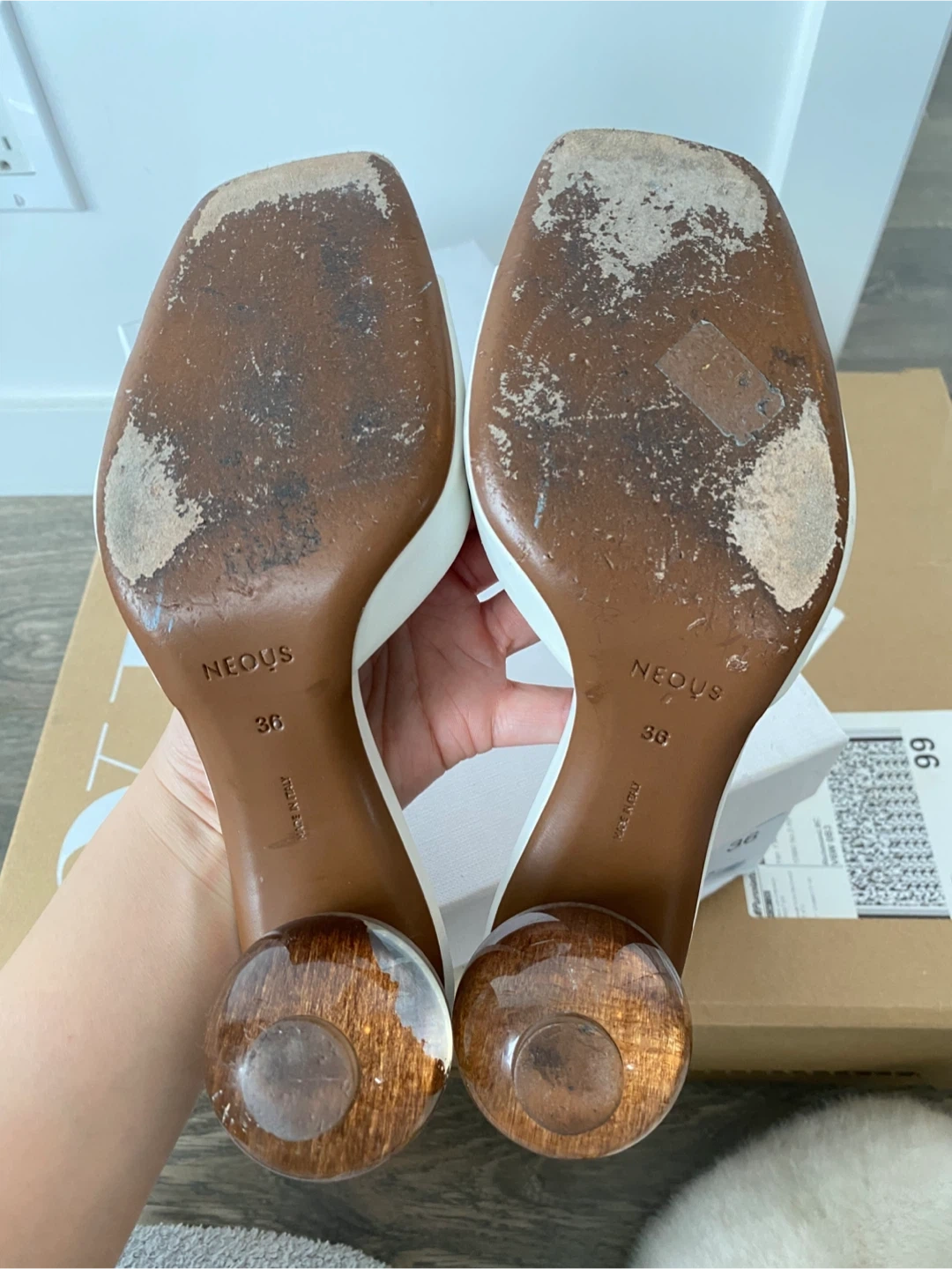 Neous white leather slide heeled mules. Features a unique wooden and clear block heel. Leather upper and sole. Made in Italy.