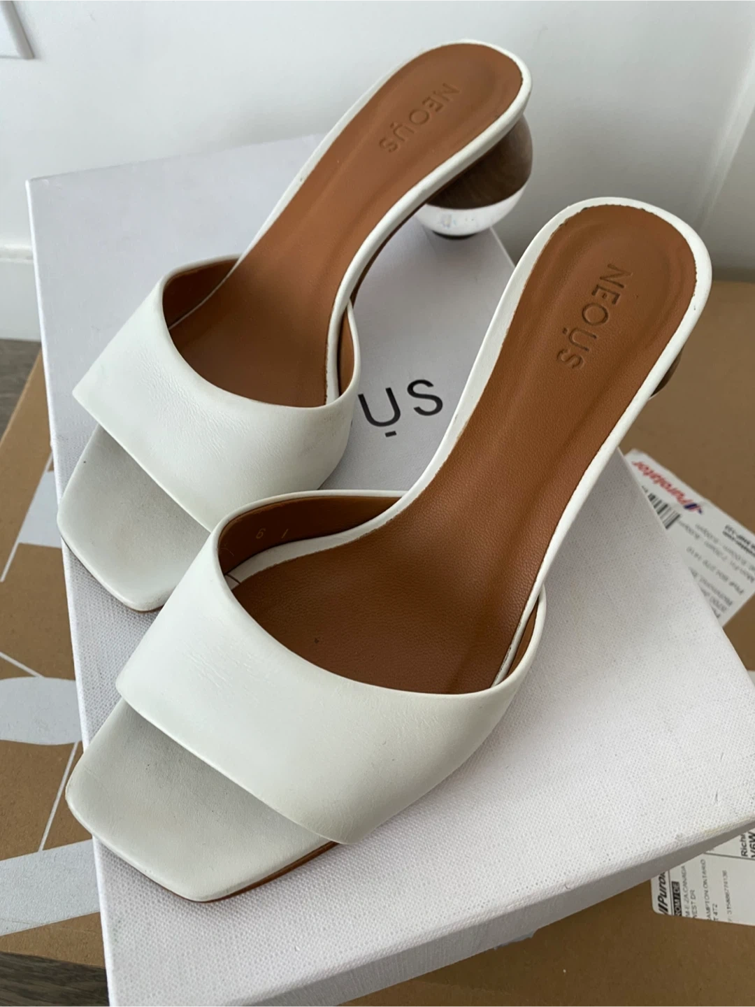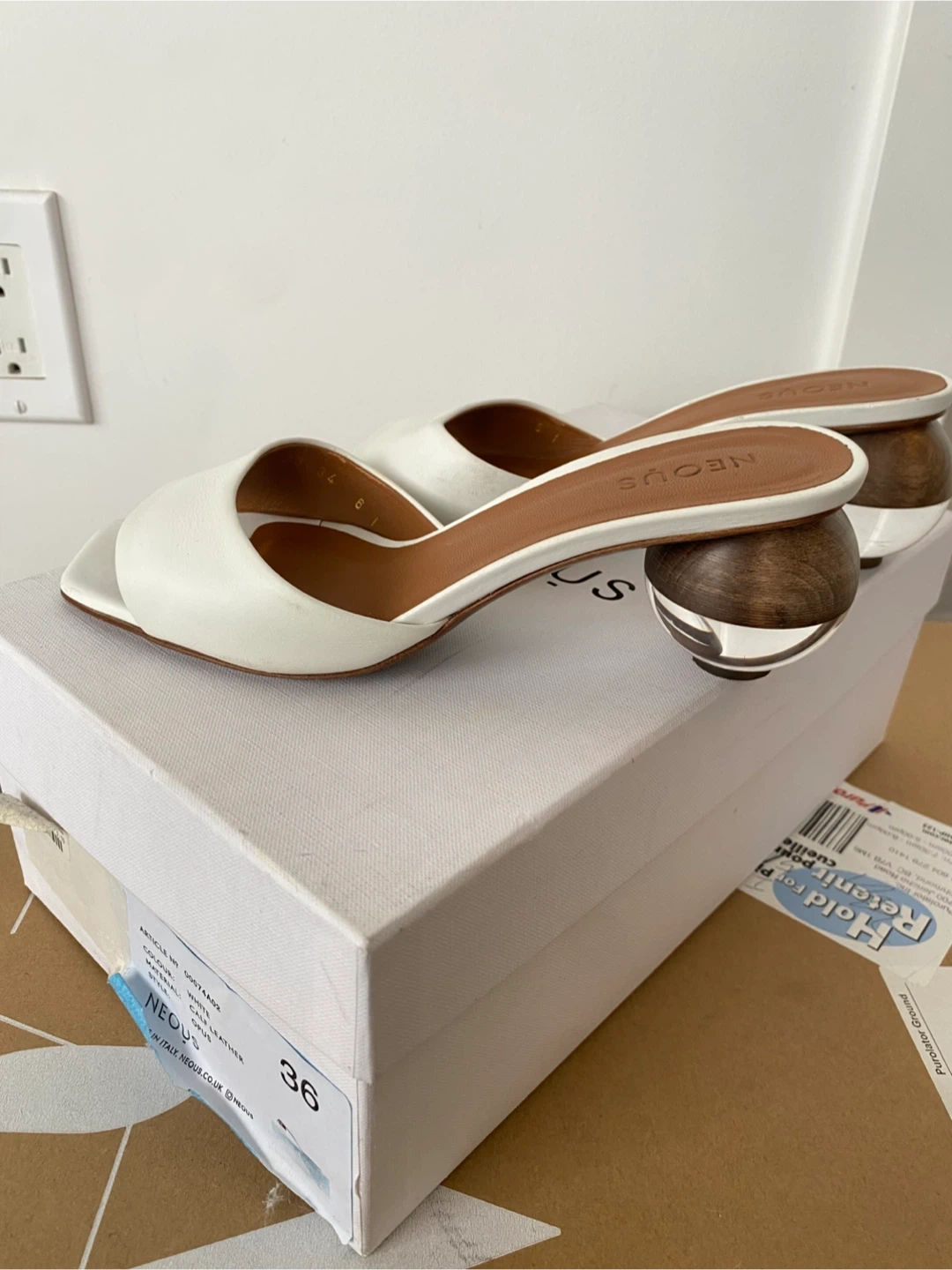 Neous white leather slide heeled mules. Features a unique wooden and clear block heel. Leather upper and sole. Made in Italy.