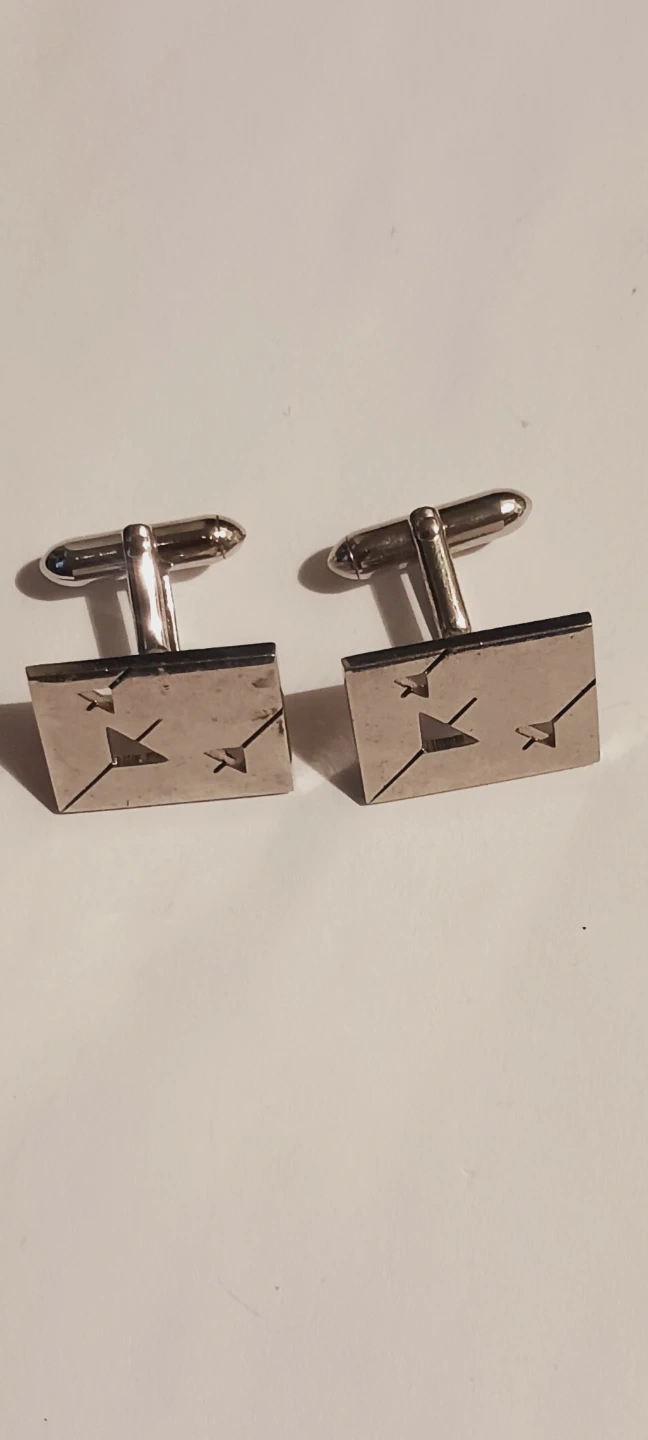 A pair of Mid Century silver-tone cufflinks featuring a subtle arrow design. They're made of metal with a swivel backing. These cufflinks add a stylish touch to any dress shirt! 1"×1". Excellent condition..ALL MY PRICES ARE NEGOTIABLE !!
