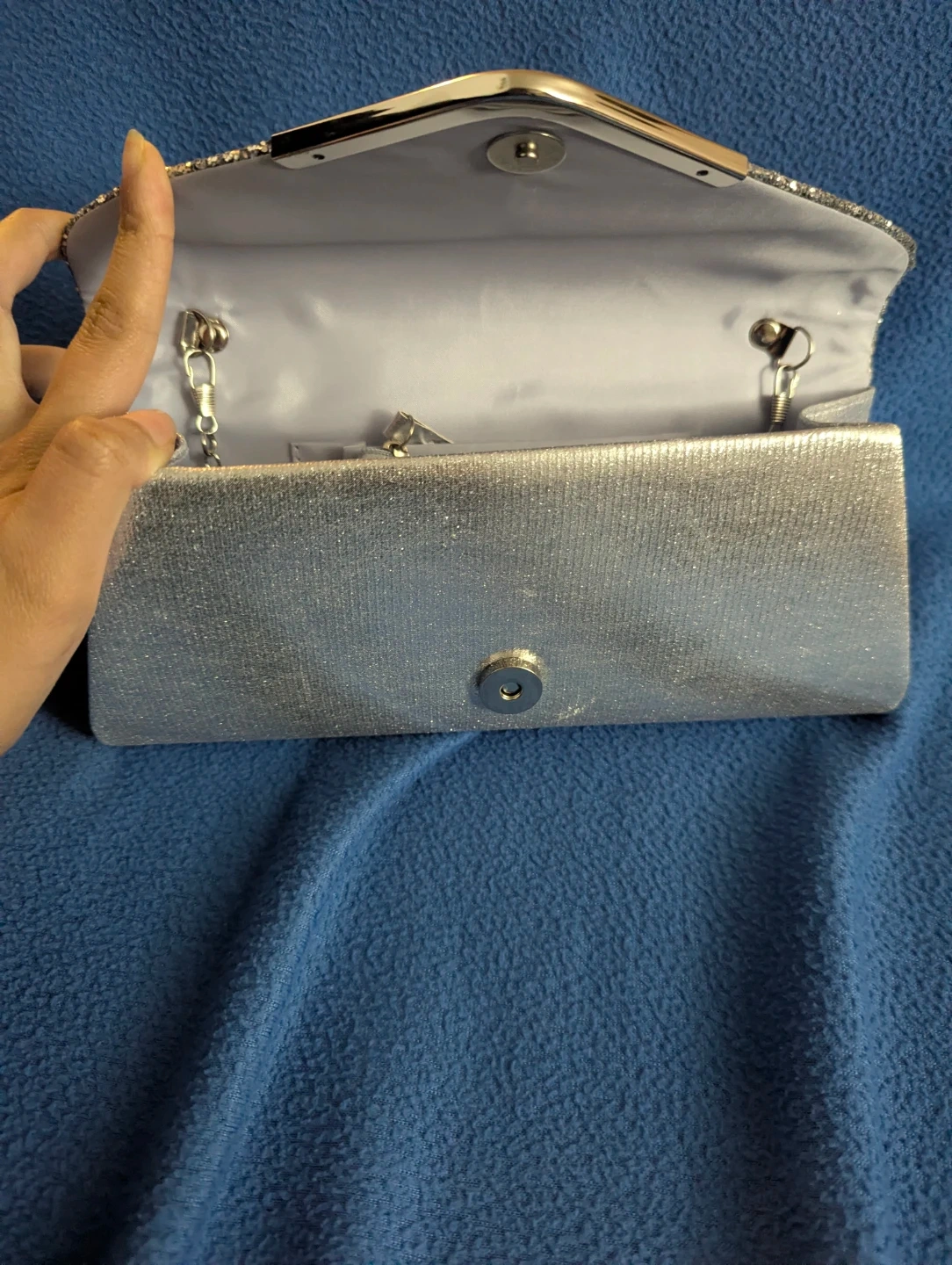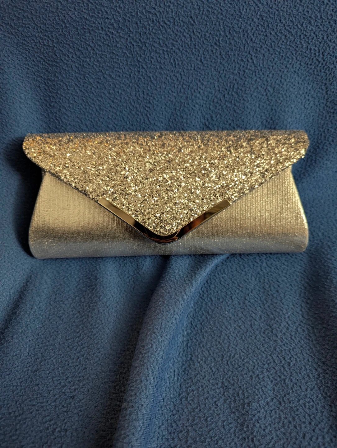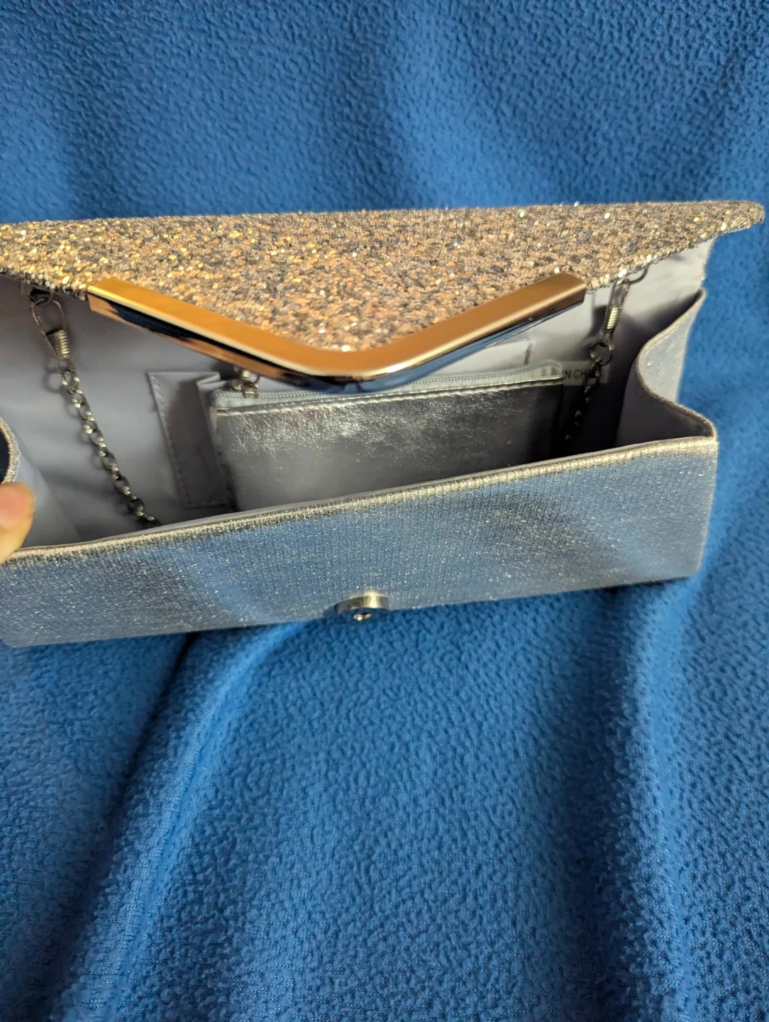 Sparkly silver clutch purse. It's an envelope style with a glitter flap and a metallic trim. Includes a small matching coin purse inside. Comes with a detachable silver chain strap. Completely new, never used!