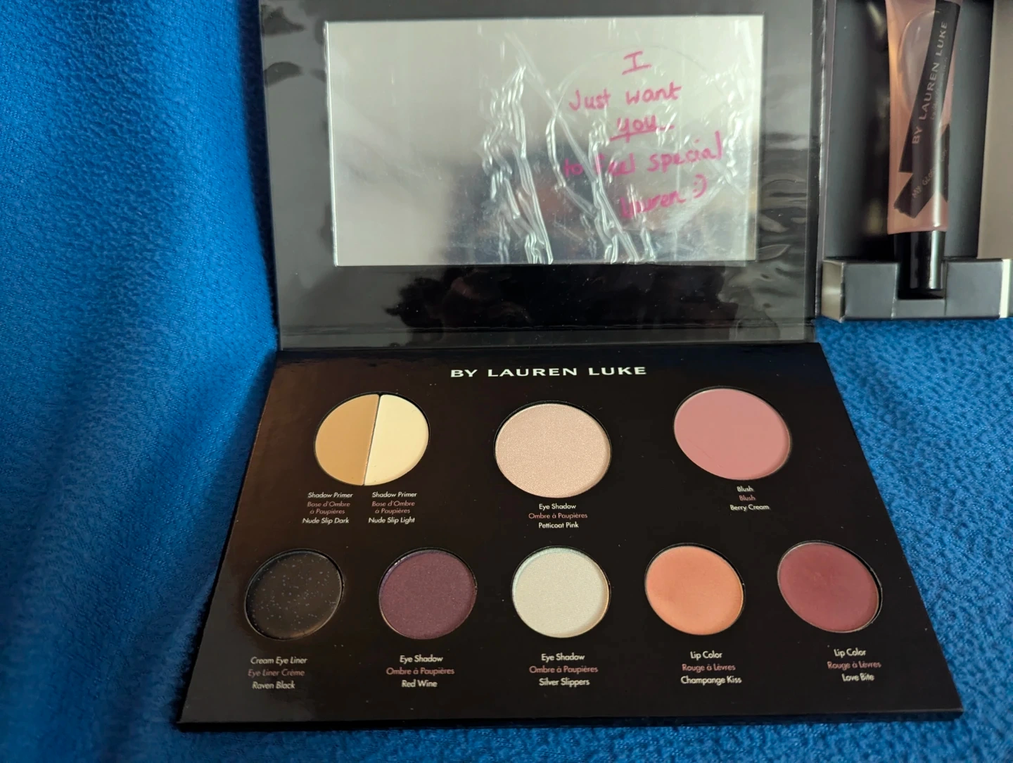 This BY LAUREN LUKE My Vintage Glams palette includes eyeshadows, blush, and lip colour. It contains a total of 9 shades for eyes, cheeks, and lips. There's a bonus lip gloss! It's got everything you need for a quick glam look. Completely new, never used.