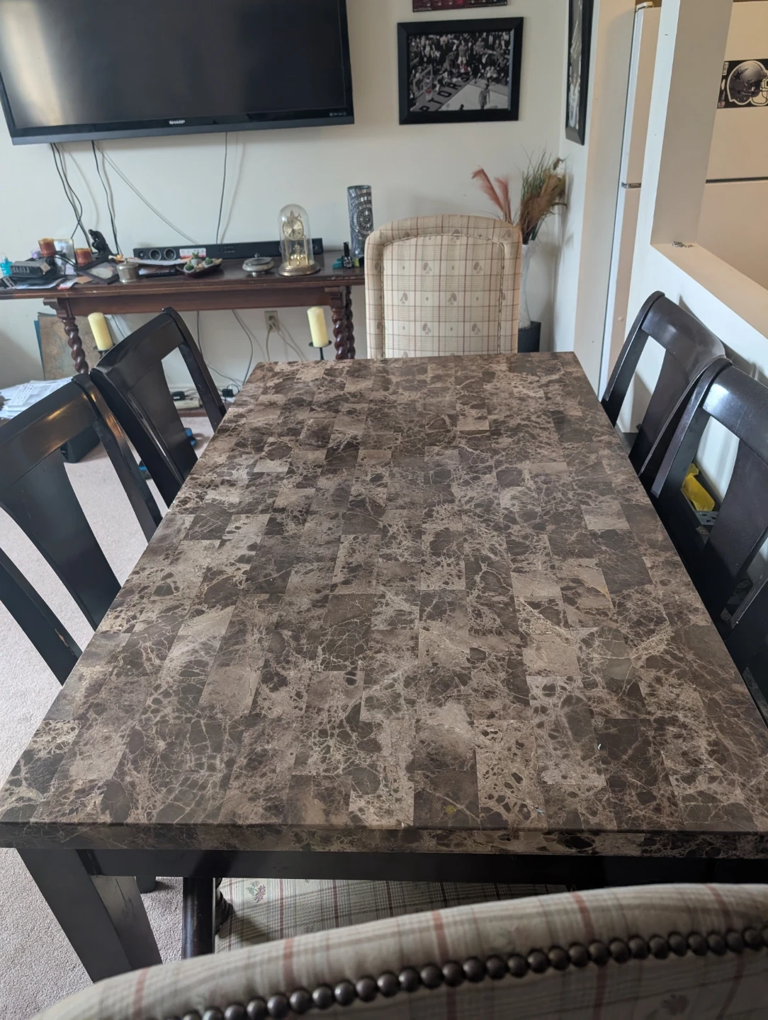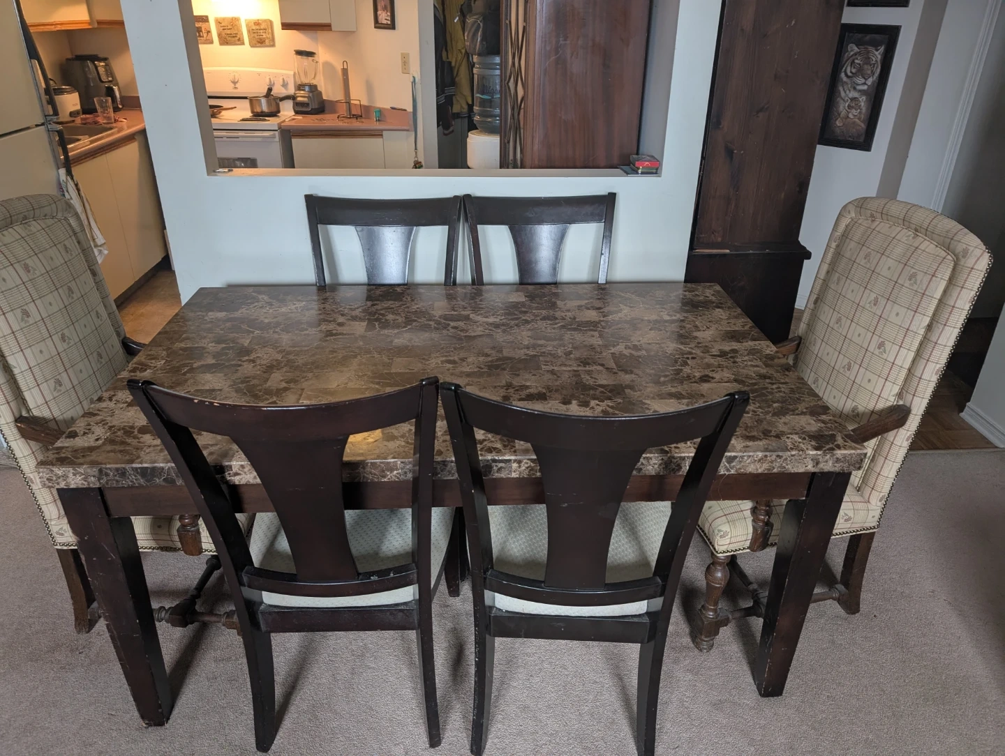 This dining set includes a marble-look top table and six chairs. The table has a dark wood frame and is upholstered with checkered fabric seats. It's suitable for family dinners or entertaining guests.