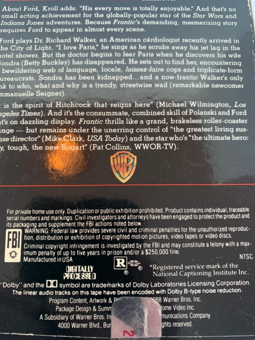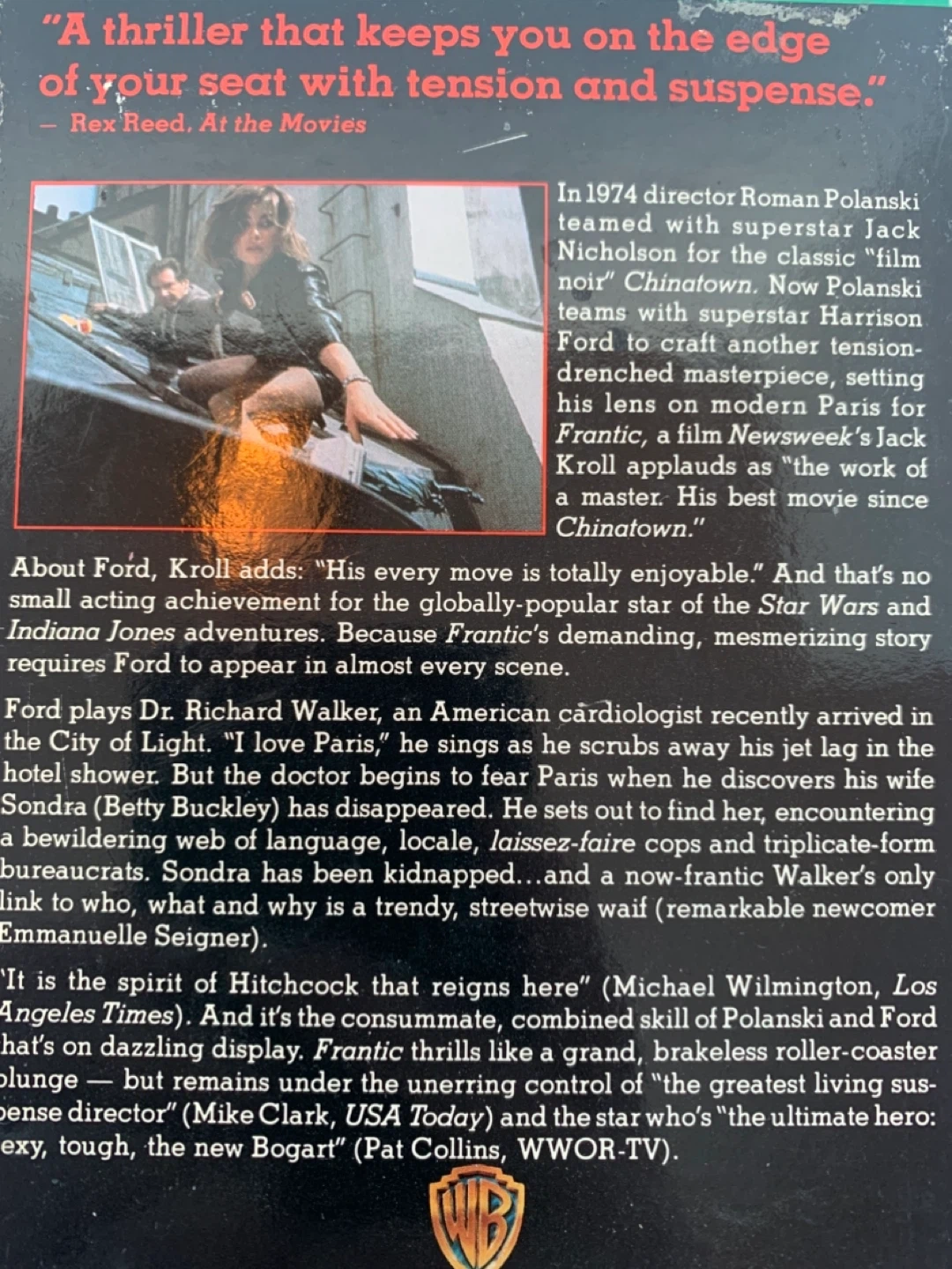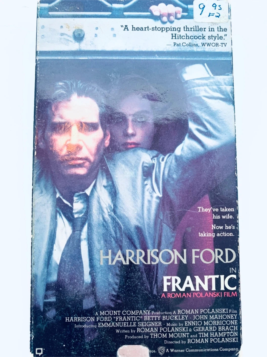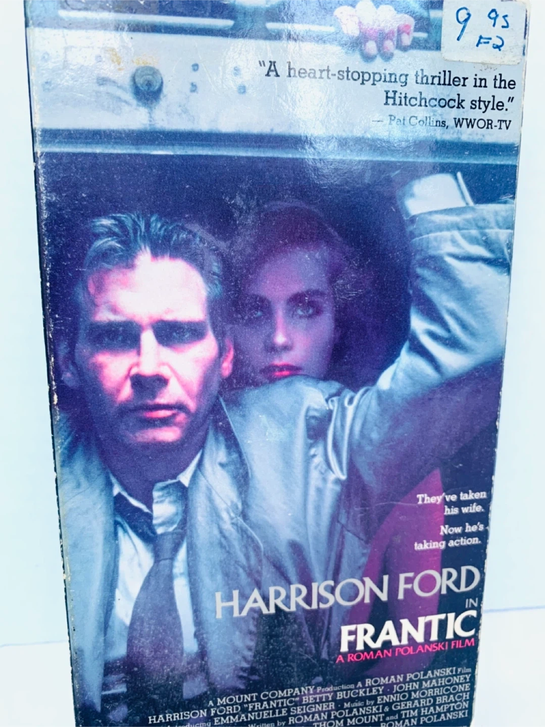 Harrison Ford stars in Roman Polanski's thriller Frantic. This VHS tape features a suspenseful plot involving a doctor searching for his kidnapped wife in Paris. It's a classic film directed by Roman Polanski.