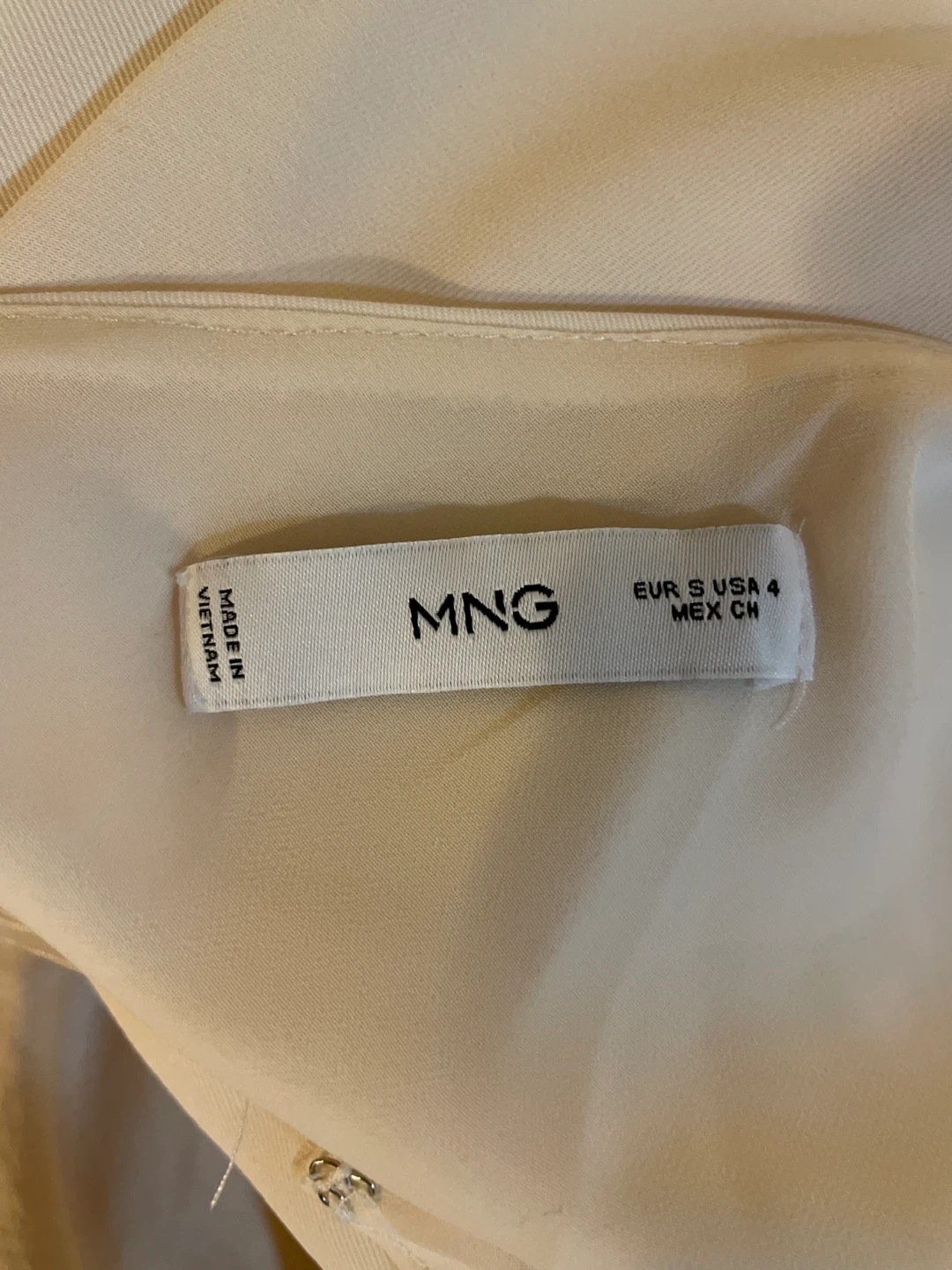A cream one-shoulder ASYMMETRICAL PLEATED DRESS from Mango. Midi design. Fitted design. Asymmetrical neckline. Sleeveless. Side ruffles. Side slit. Side zip closure. Inner lining. Made in Vietnam. Size EUR S, USA 4, MEX CH.