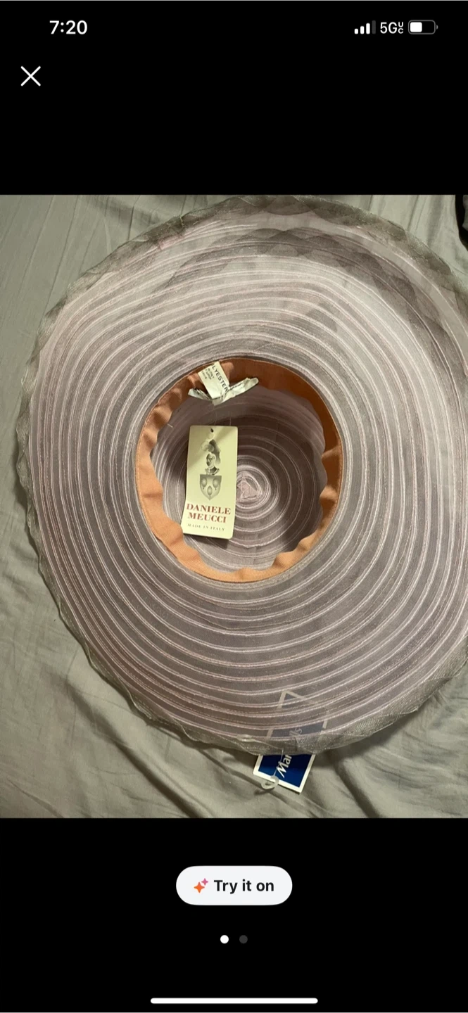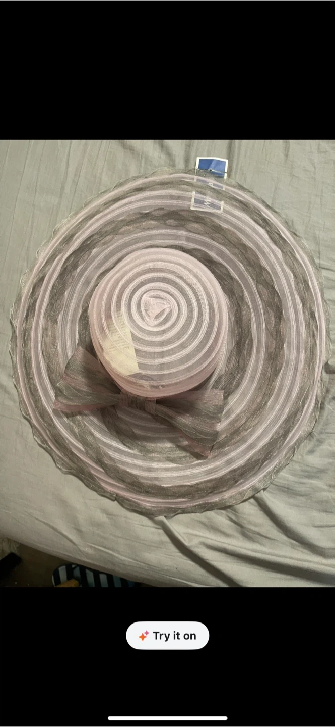 Daniele Miele wide brim hat. Features a delicate pink and grey mesh material with a decorative bow. This hat's wide brim offers stylish sun protection.