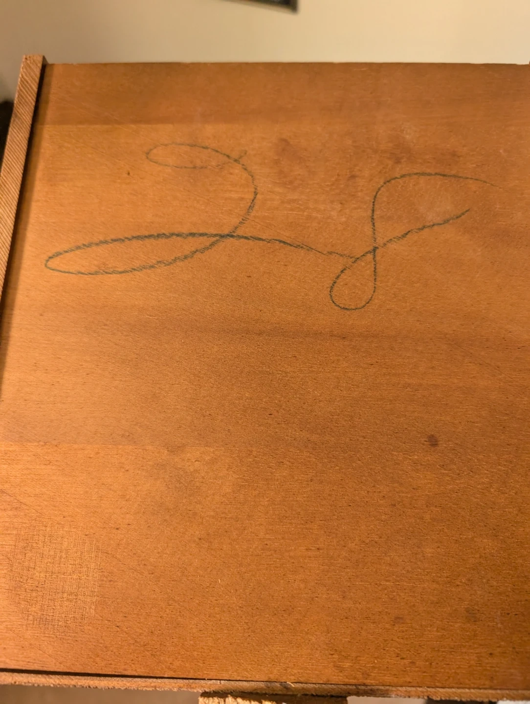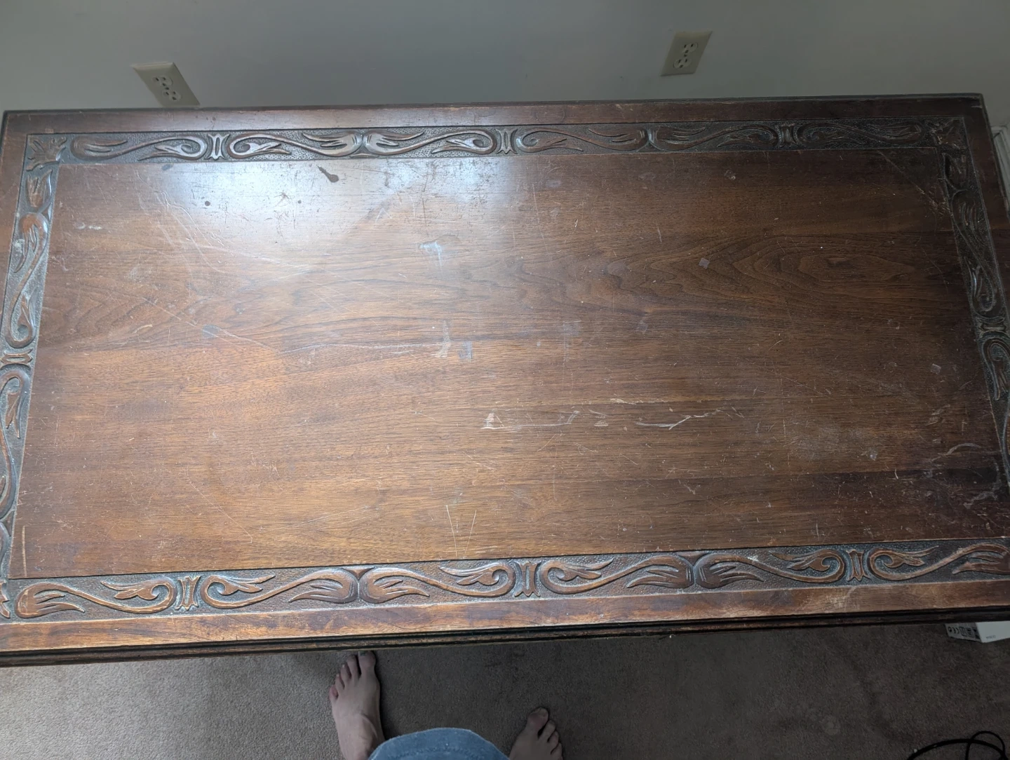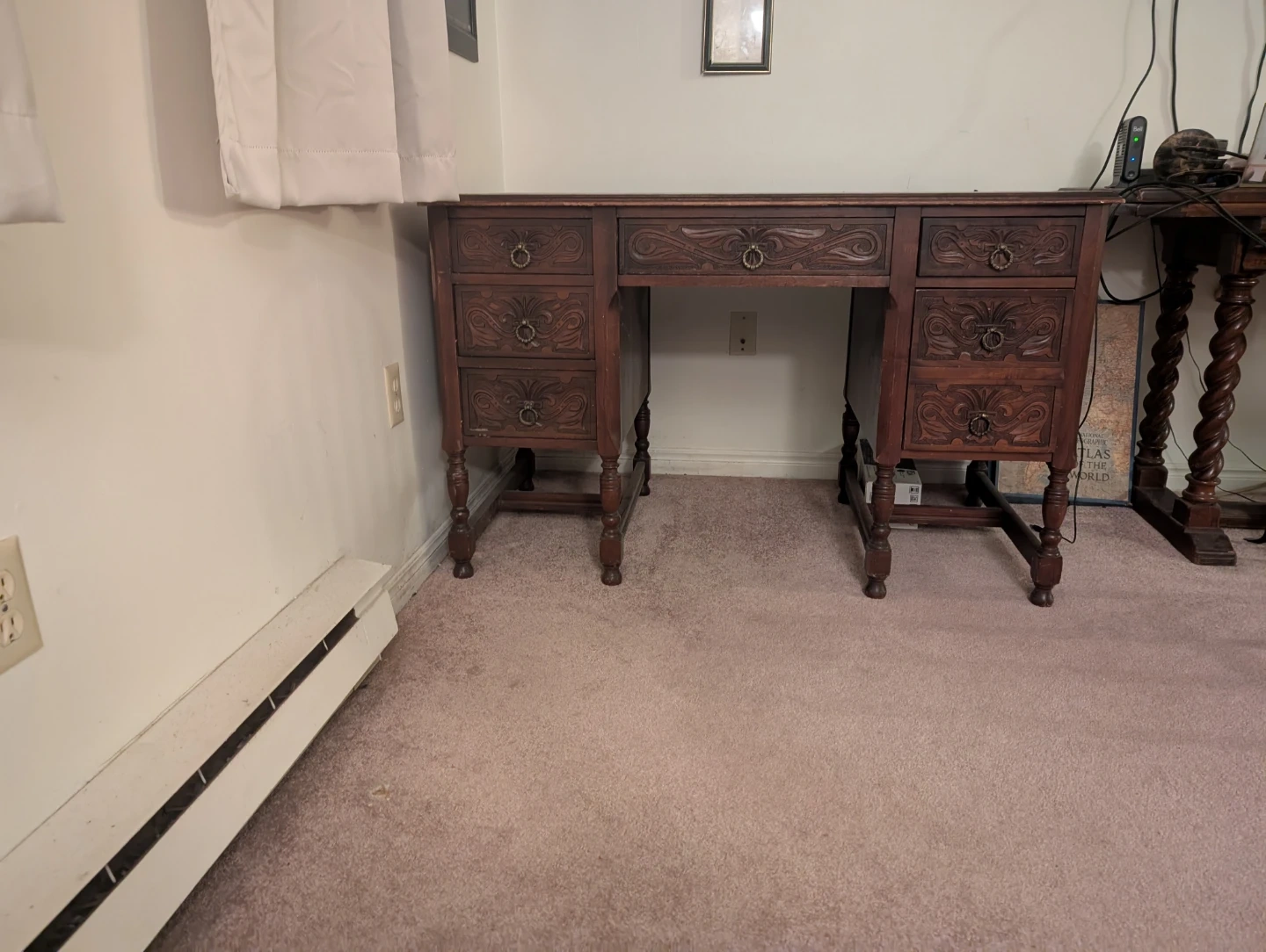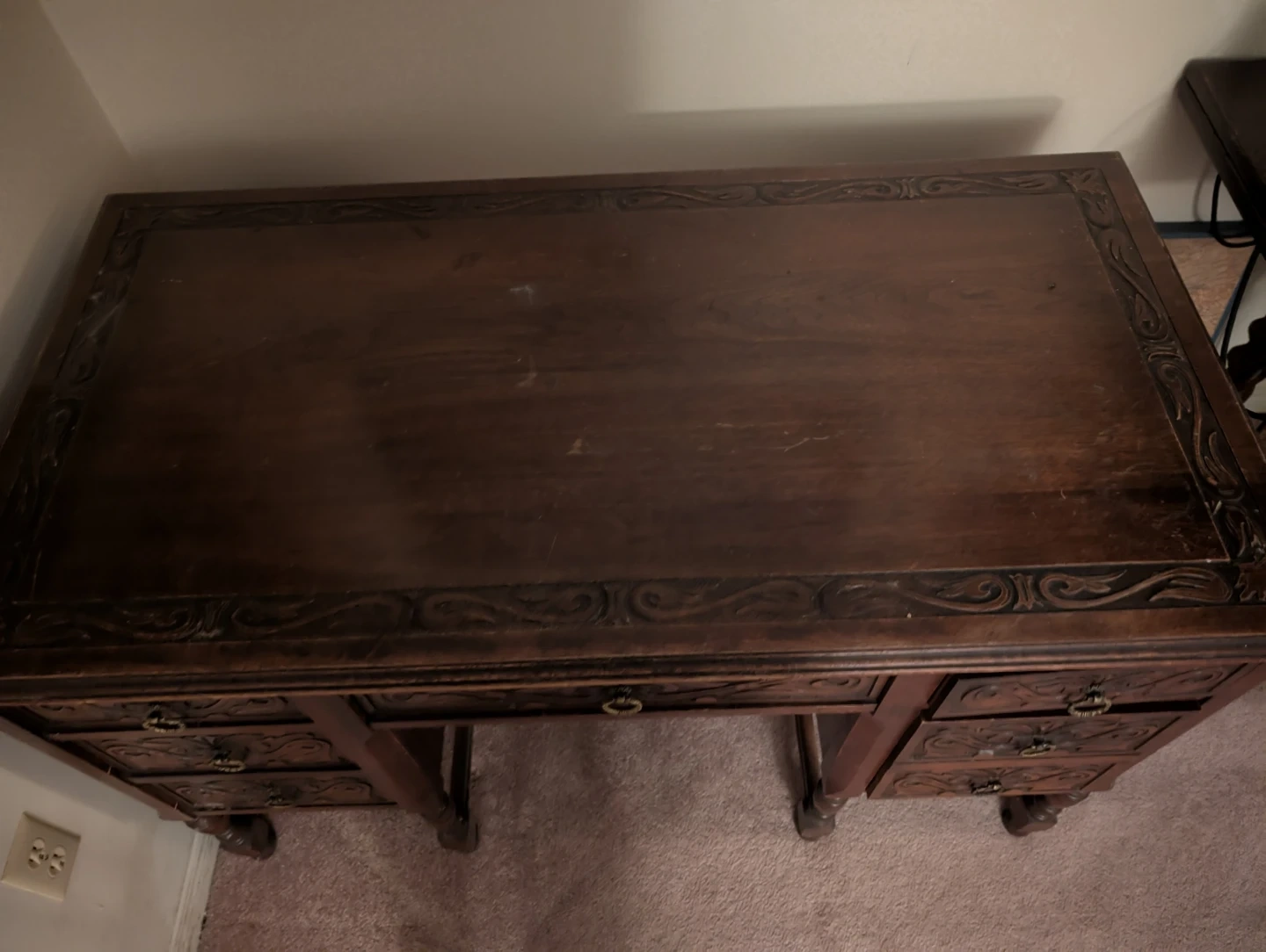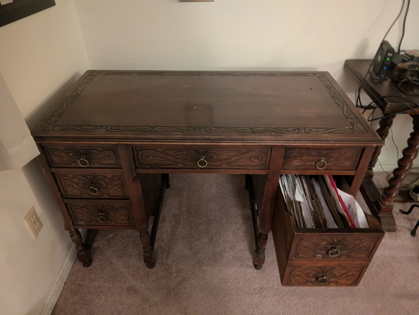 This is a vintage wooden desk with detailed carvings along the edges and drawers. It features multiple drawers for storage, including one that appears to hold files. The wood has a rich, dark finish and shows some signs of wear consistent with its age.