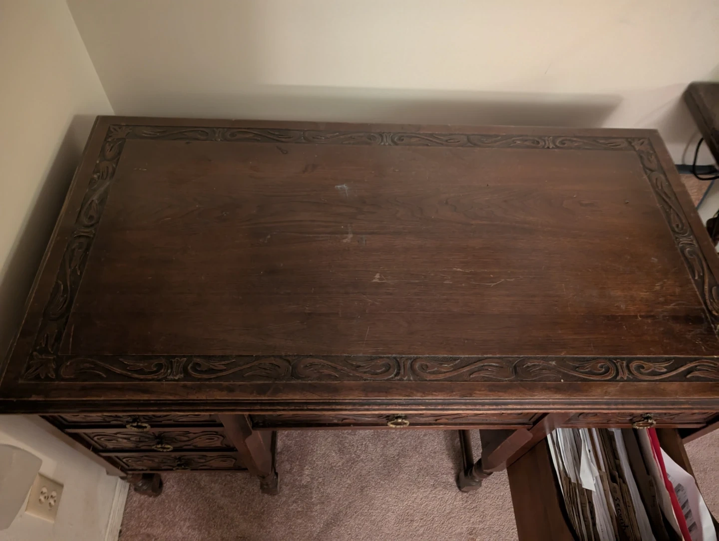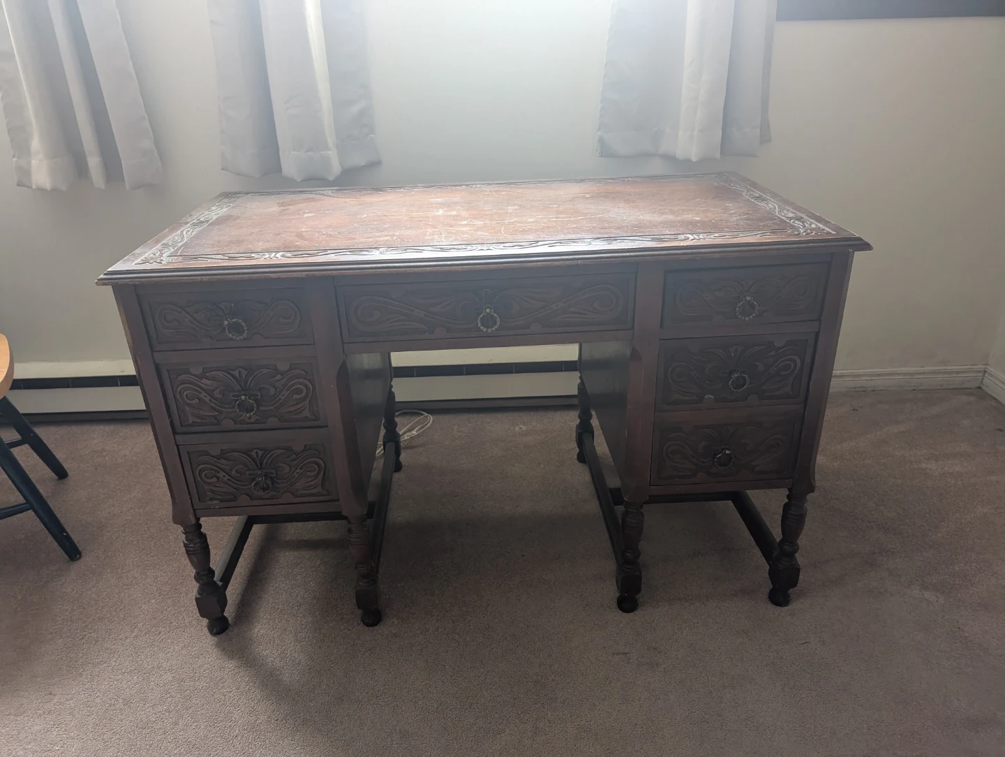 This is a vintage wooden desk with detailed carvings along the edges and drawers. It features multiple drawers for storage, including one that appears to hold files. The wood has a rich, dark finish and shows some signs of wear consistent with its age.