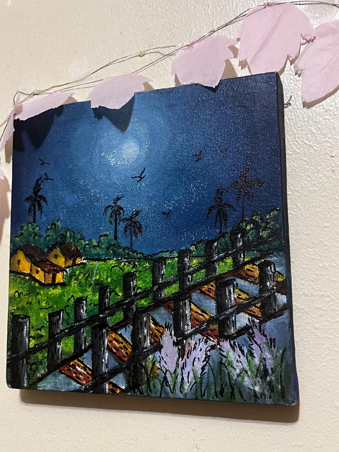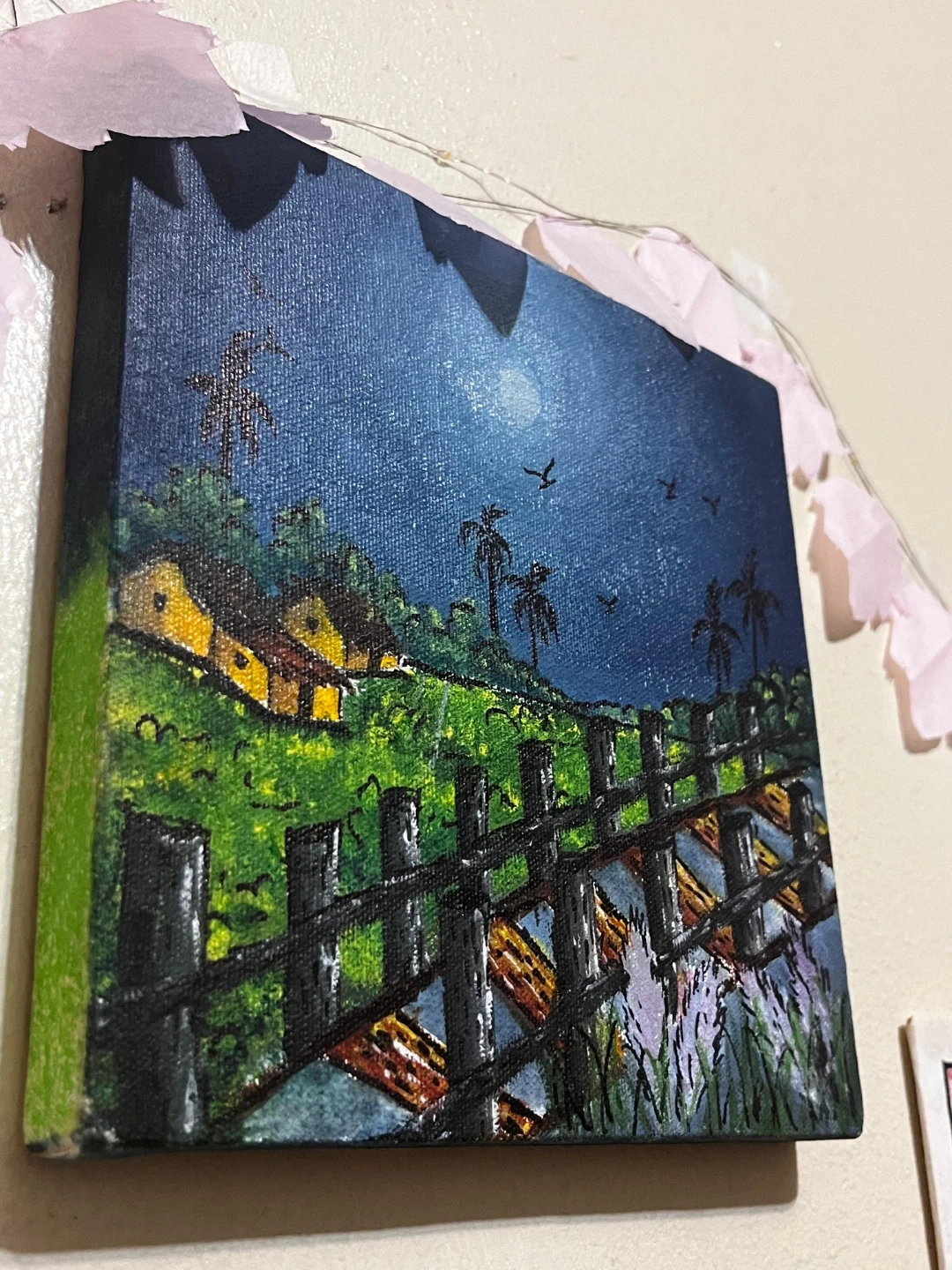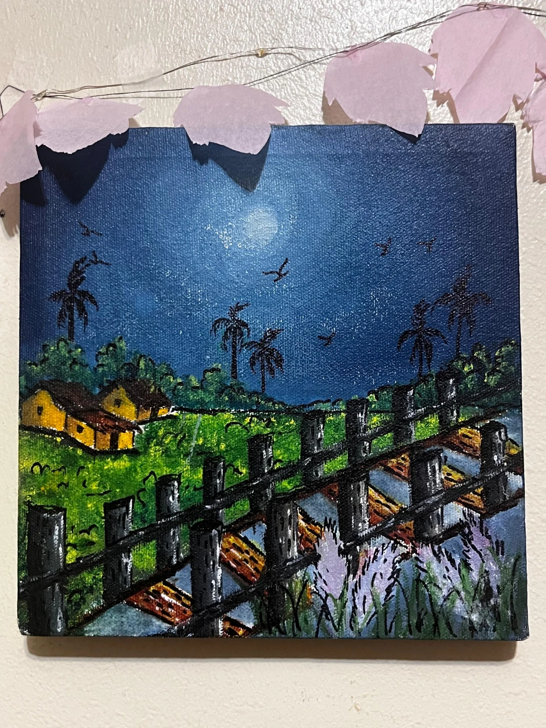 This is an original acrylic painting on canvas depicting a vibrant night landscape. It features a moonlit sky, rolling hills with houses, and a rustic wooden fence in the foreground with flowers. The canvas is framed and ready to hang.