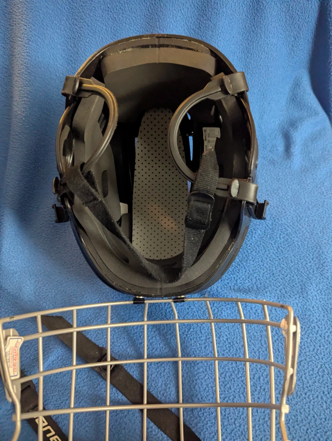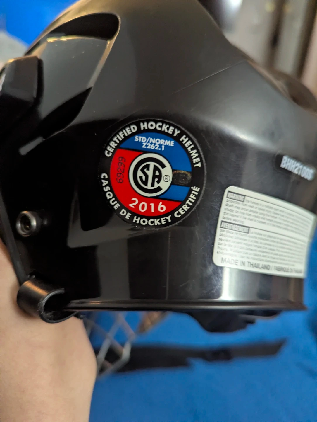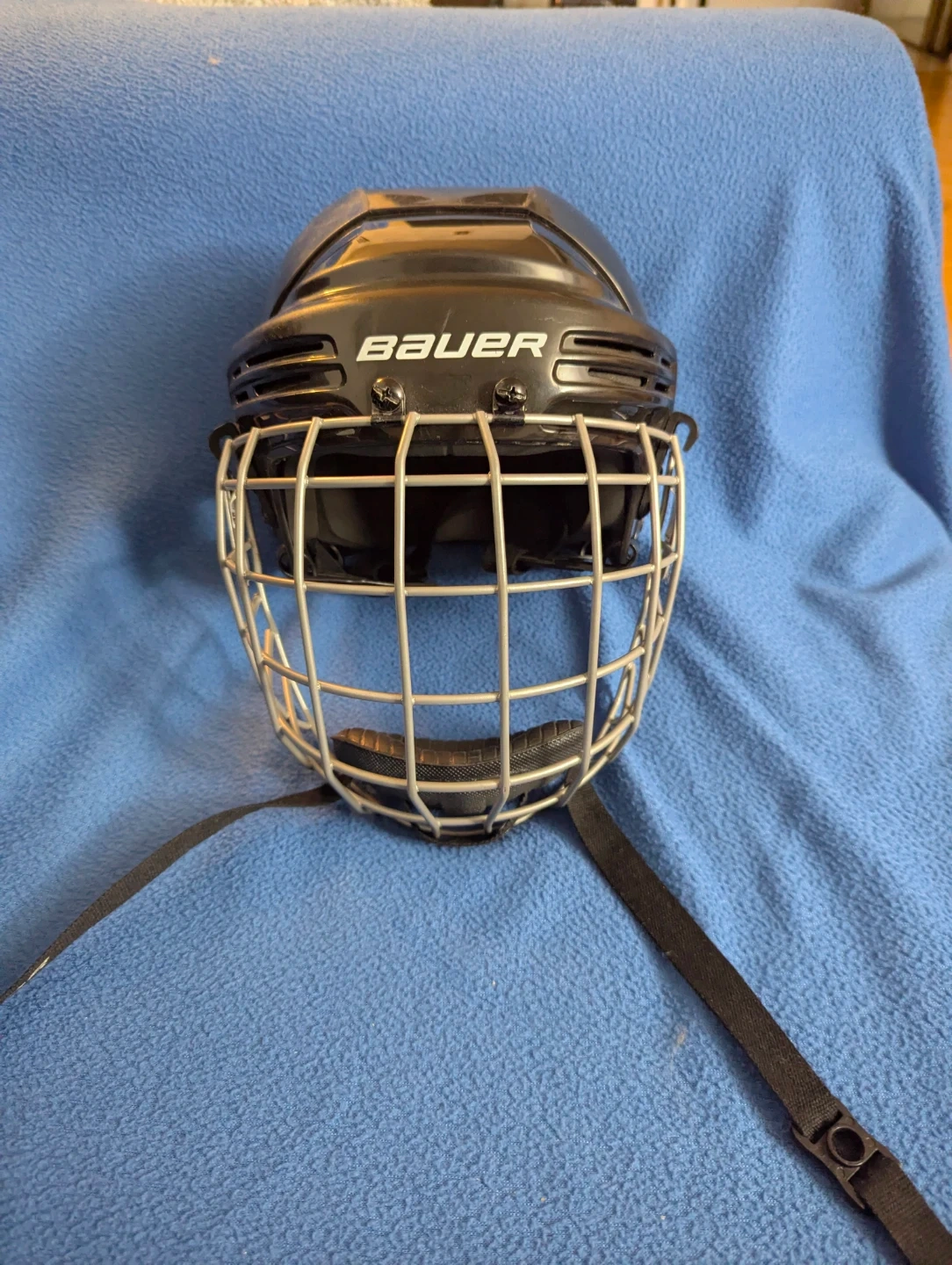 This is a black Bauer hockey helmet with a silver cage. It's a certified hockey helmet. It comes with adjustable straps for a secure fit. Safety first! Great for children who are learning to skate. The size is small (52-57cm)