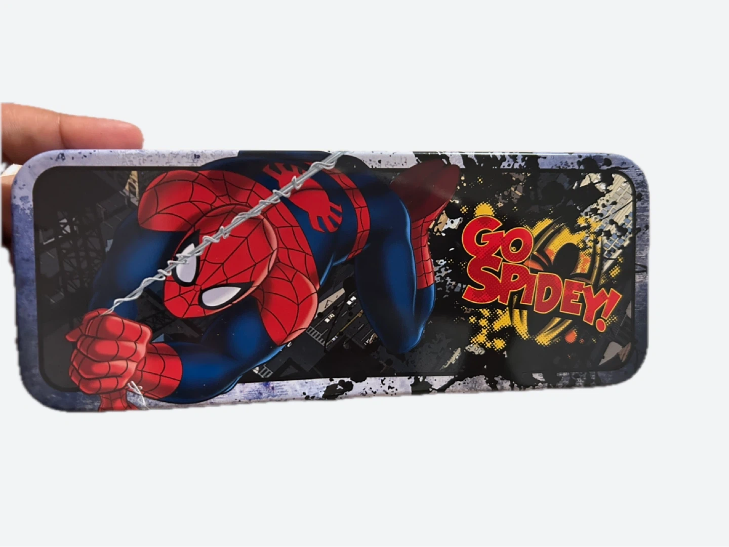 This is a metal tin box featuring Ultimate Spider-Man graphics and the "Go Spidey!" slogan. It's perfect for storing small items like pencils, art supplies, or collectibles. The tin measures approximately 8 inches long by 3 inches wide.