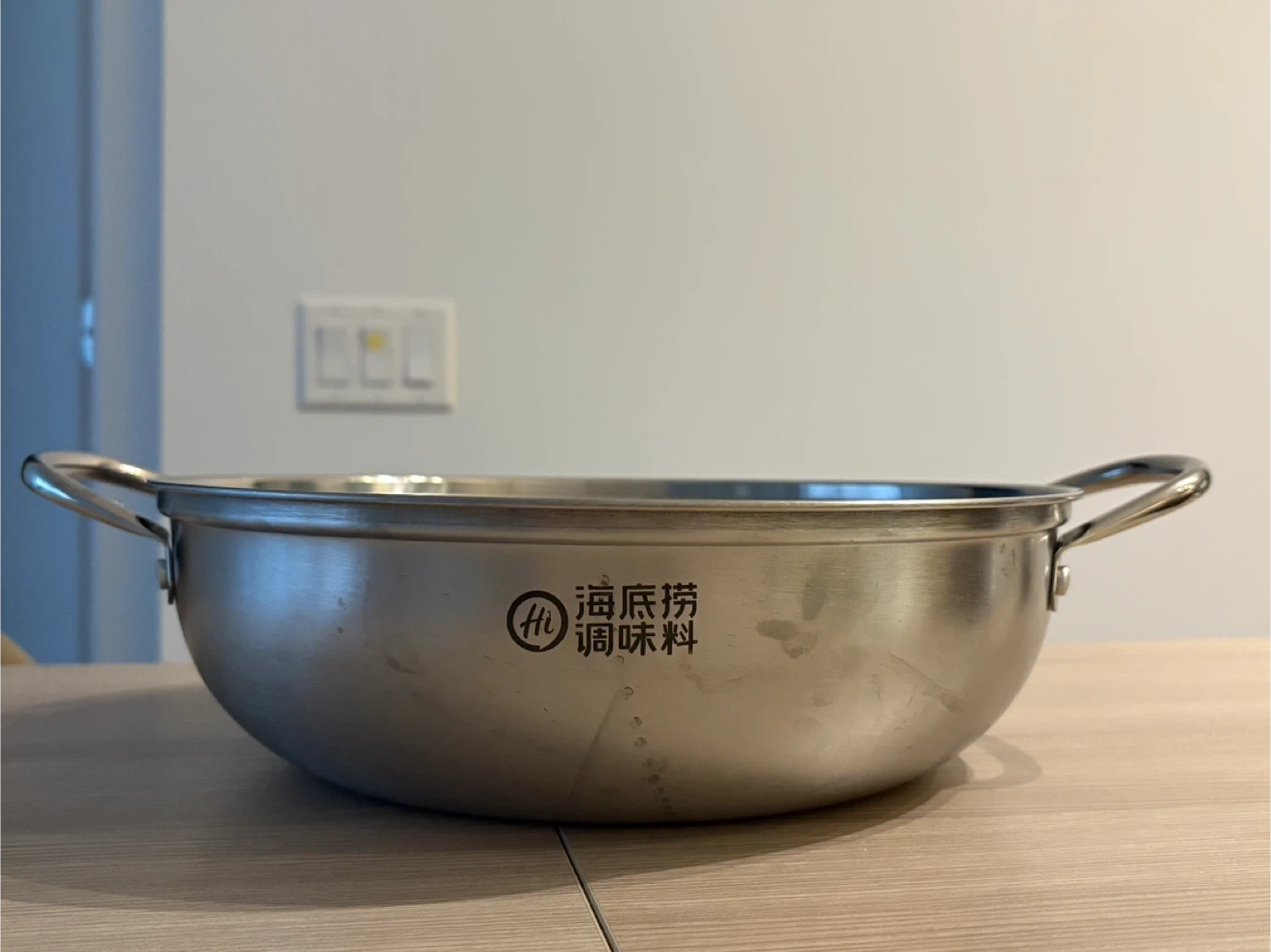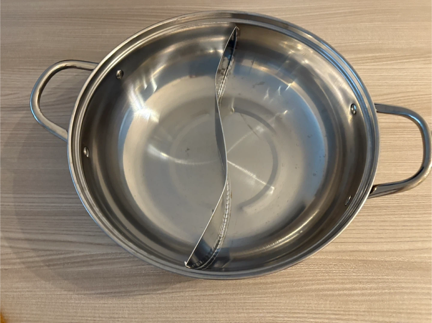 This is a stainless steel hot pot with two sections. It's durable and perfect for enjoying different broths at the same time. The handles make it easy to carry.