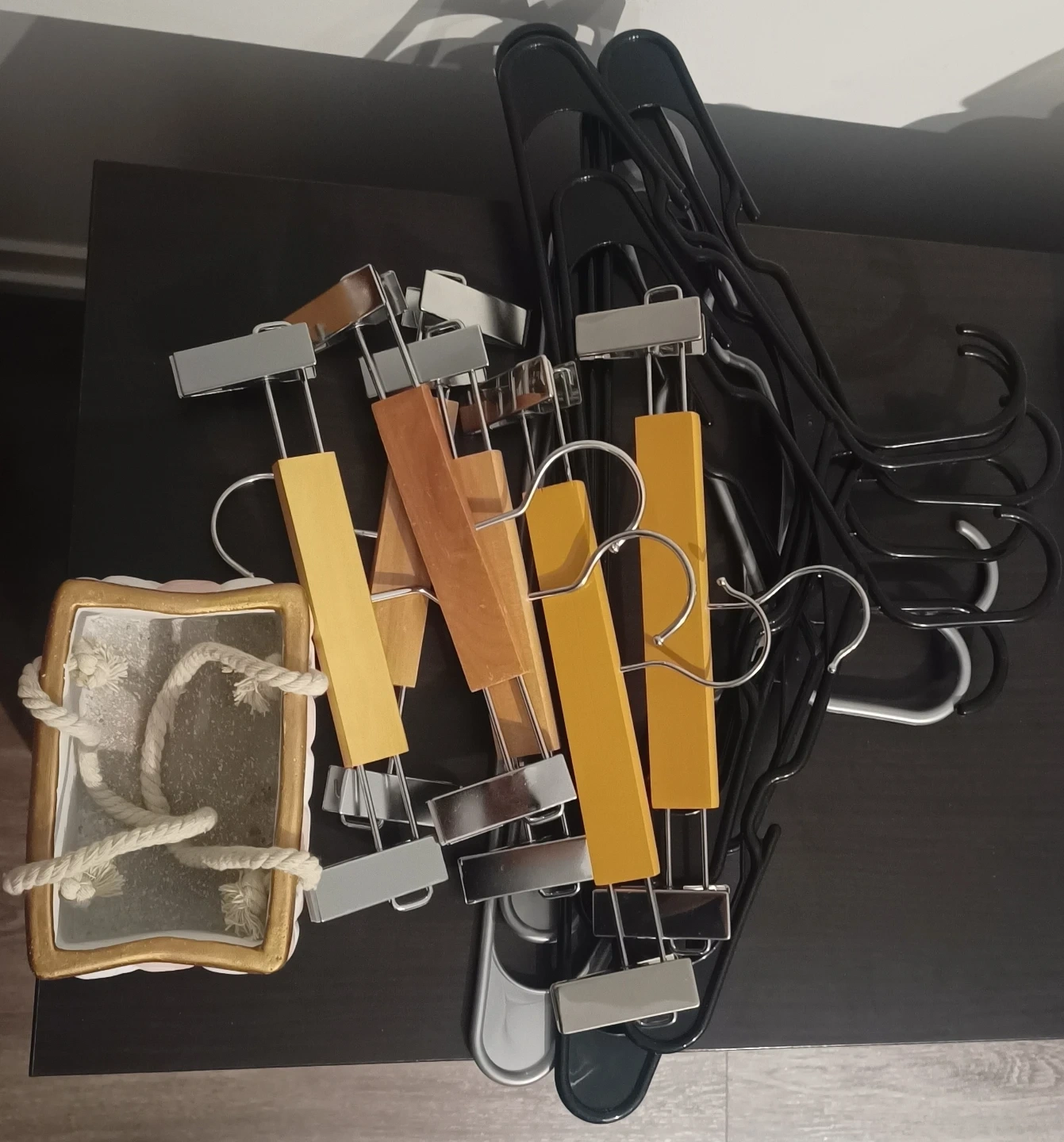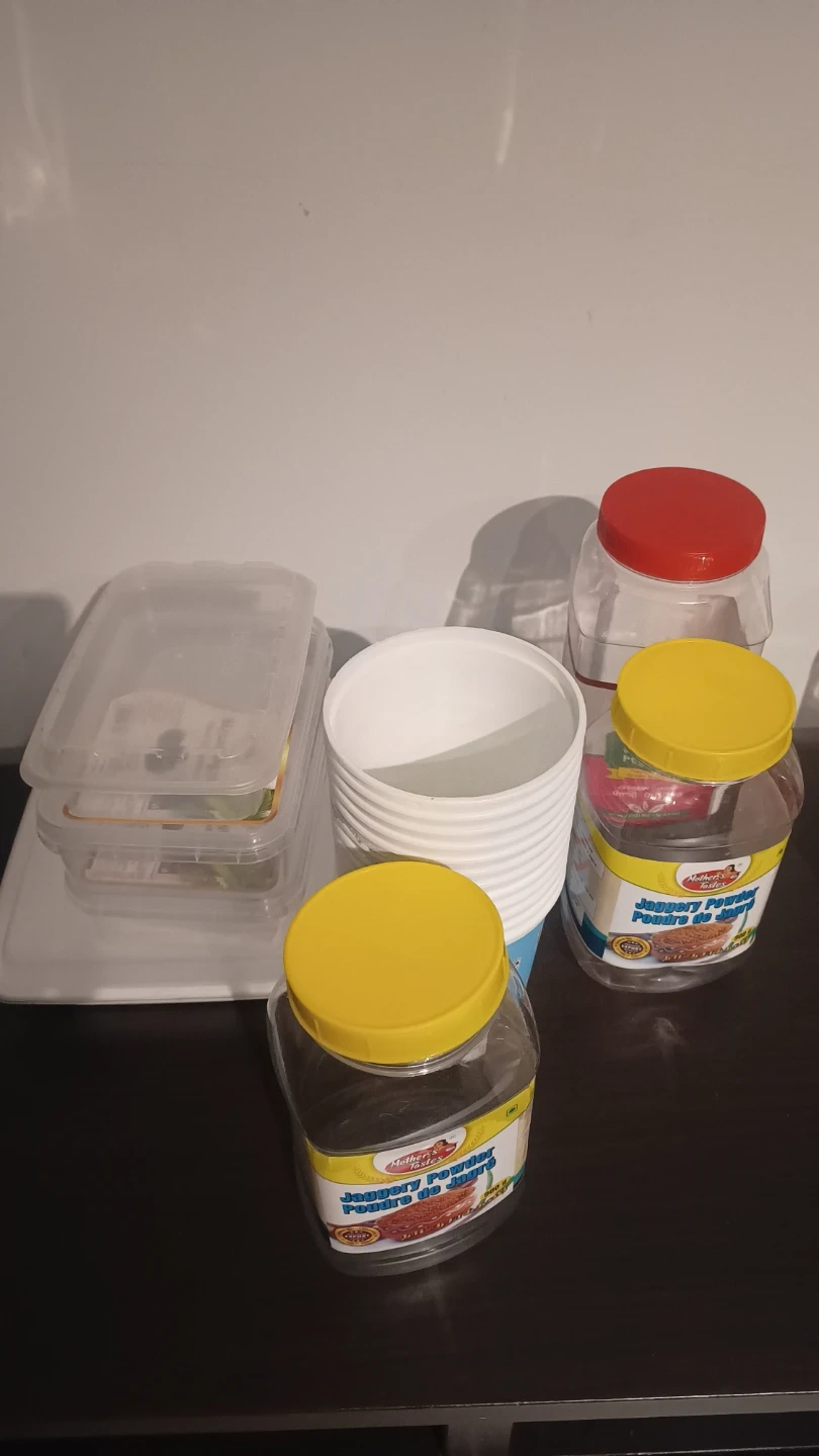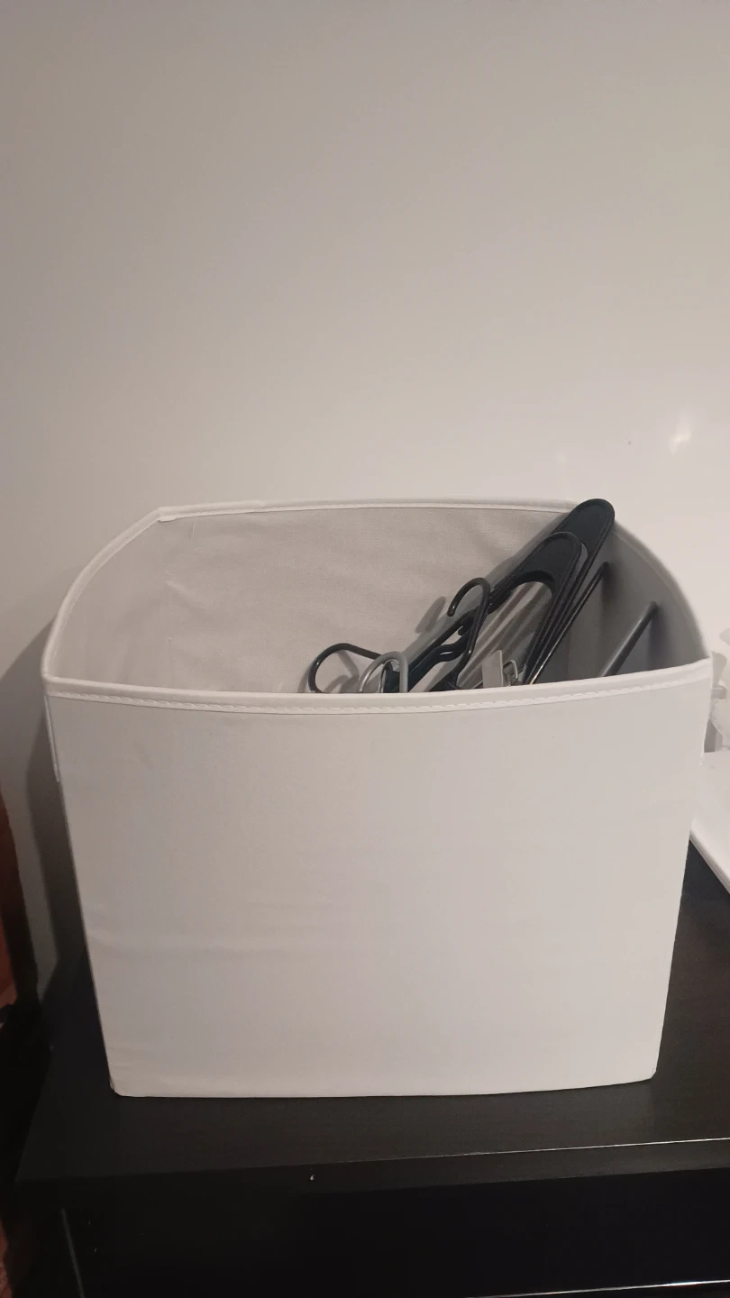 Includes a variety of black hangers, wooden clip hangers, and a white fabric storage bin. Also includes several plastic storage containers and jars with lids. Great for organizing your closet and kitchen!