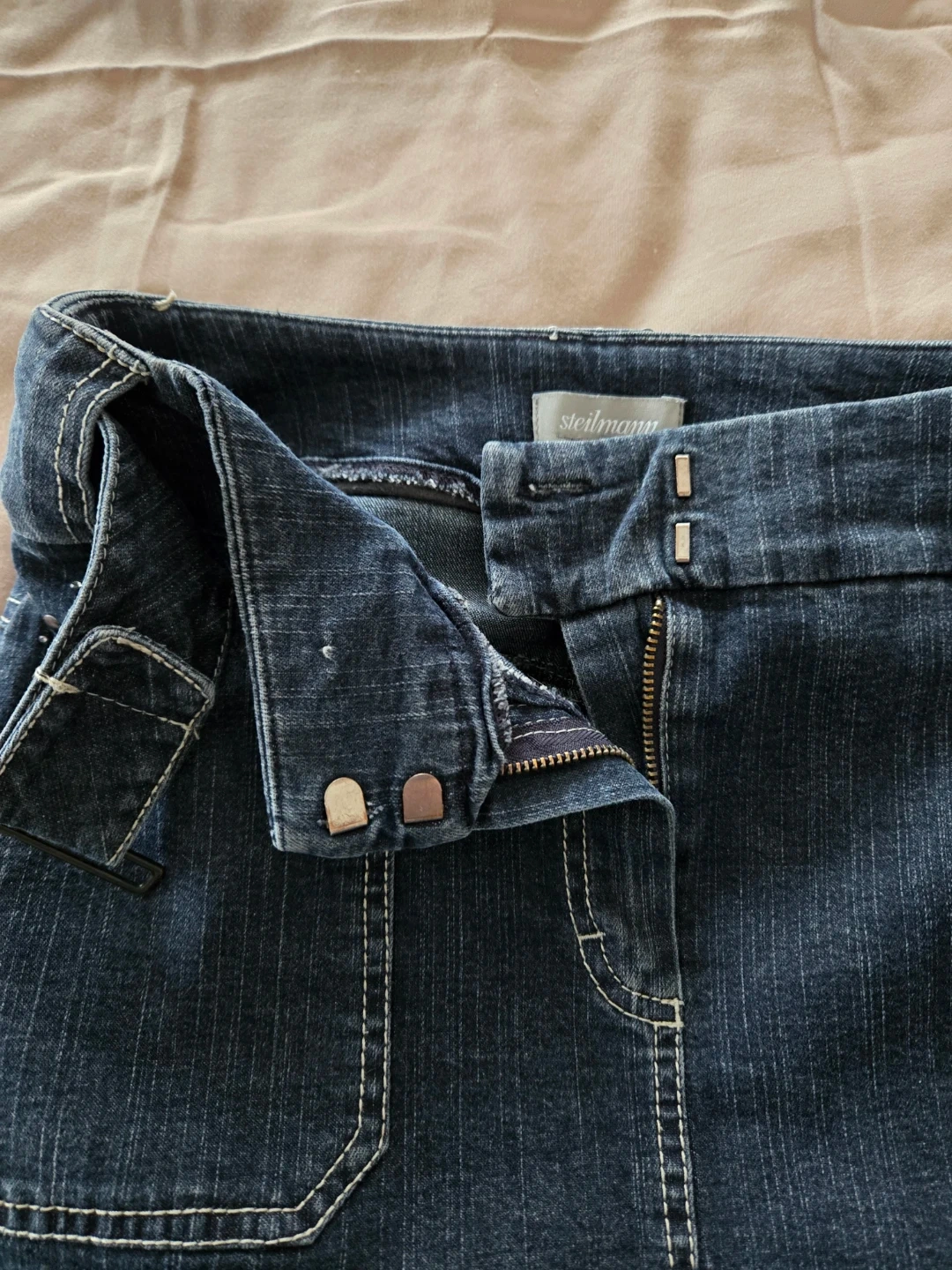 Denim A-Line skirt made of cotton and polyester blend. Steinmann brand. It features denim belt, decorative stitching and embellishments. Size medium to large. Knee length.