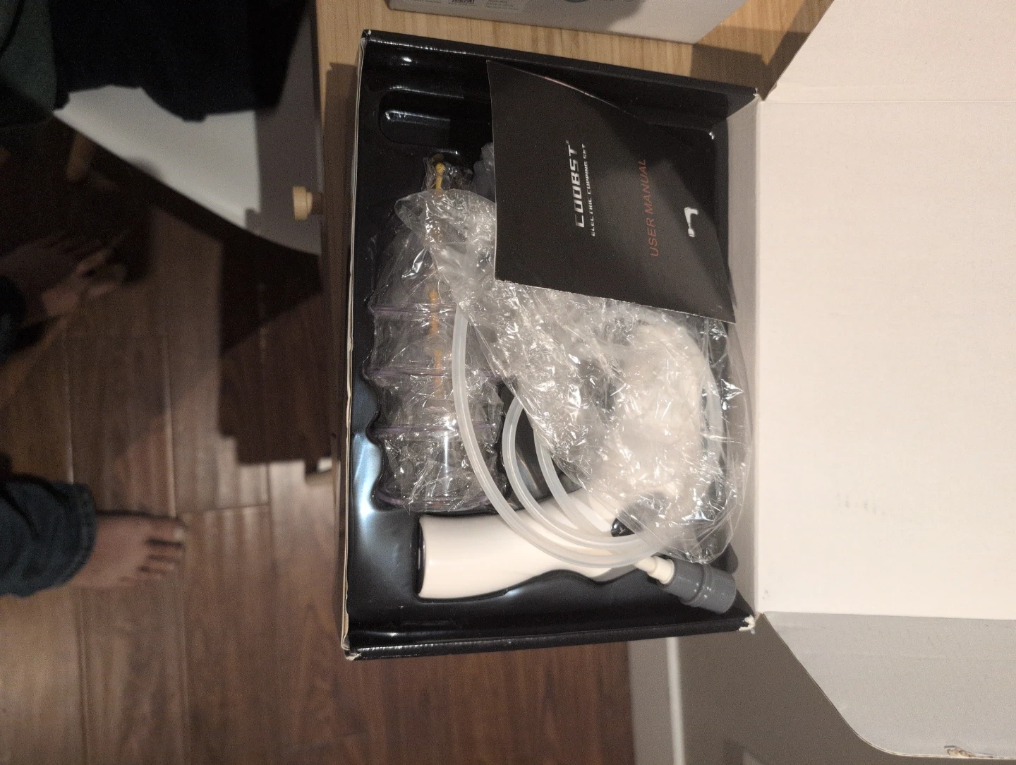 This COOBST electric cupping set comes with a user manual. It's an electric cupping device designed for various therapeutic applications. The set appears to include multiple cups and a pump mechanism.