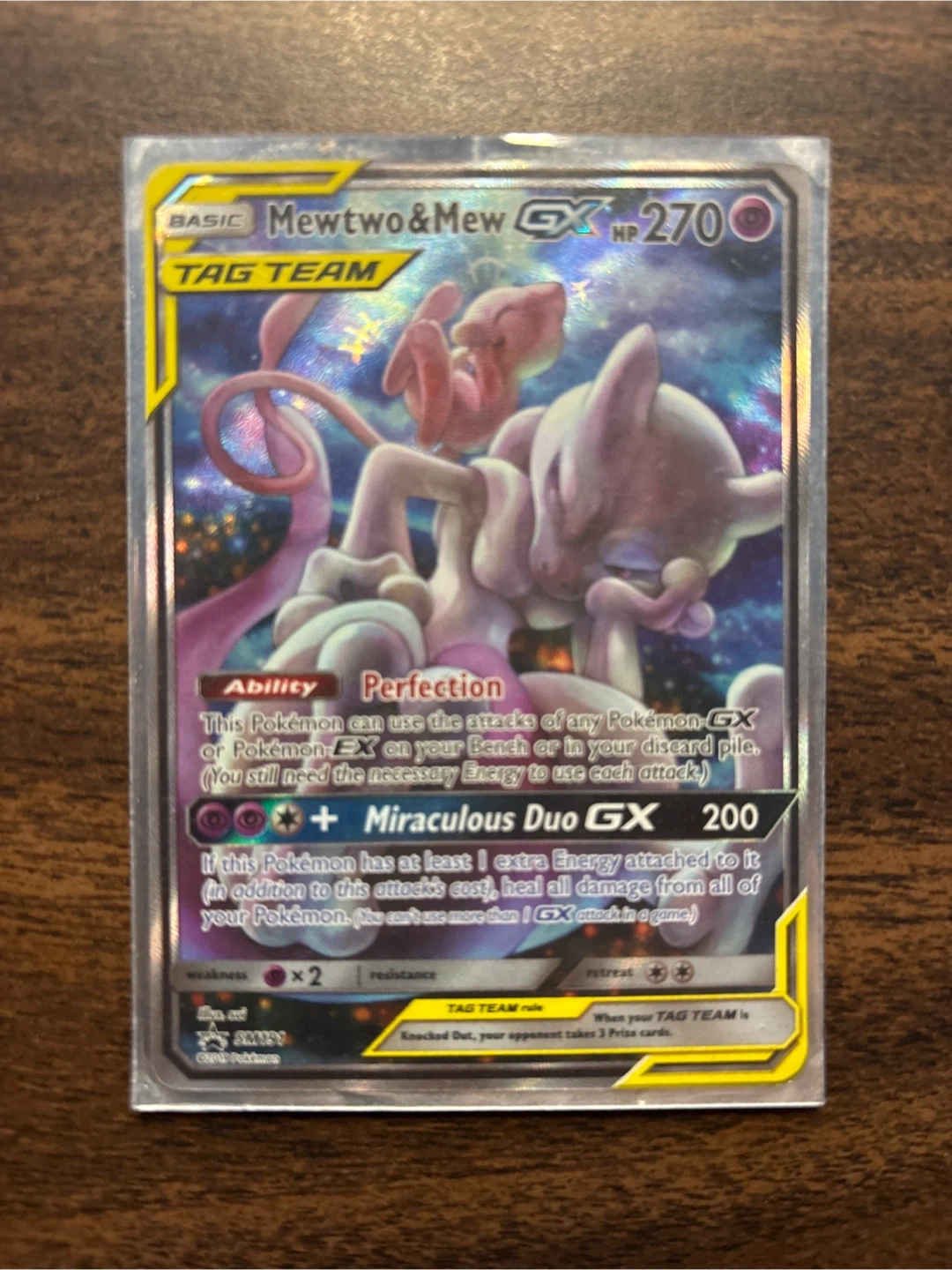This is a Mewtwo & Mew GX Tag Team Pokémon card. It features the "Perfection" ability and the "Miraculous Duo GX" attack. The card has 270 HP and the attack deals 200 damage.