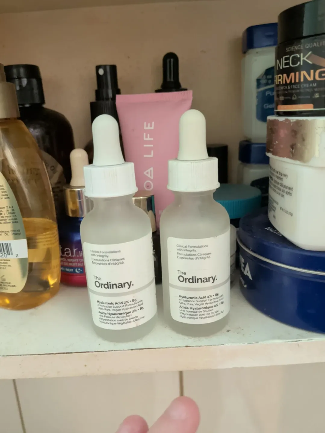Two bottles of The Ordinary's Hyaluronic Acid 2% + B5. This formula provides surface hydration with ultra-pure, vegan hyaluronic acid and vitamin B5. It's great for supporting skin hydration. Yes they are both full
