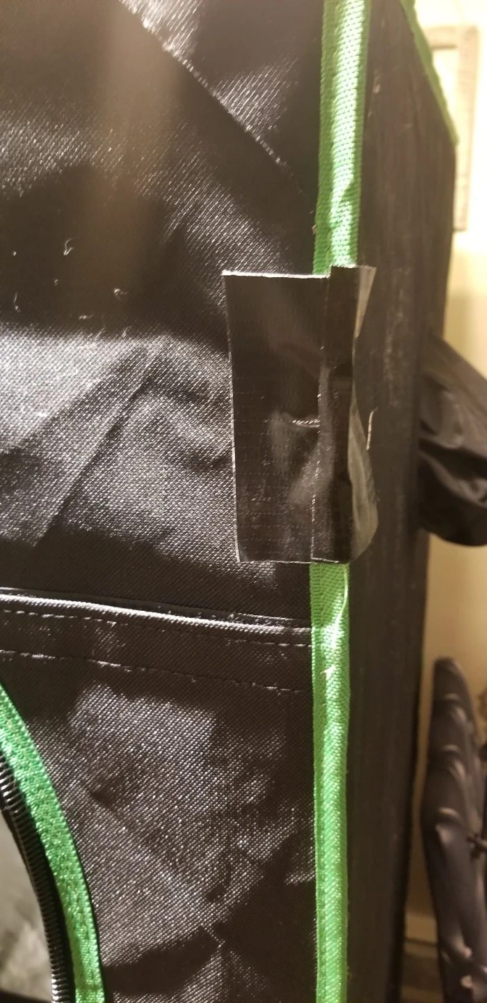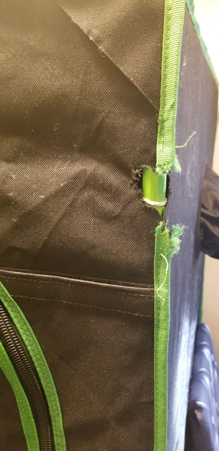 This is a VIVOSUN grow tent. It's made of durable black fabric with green trim. Includes vents and zippers for easy access. Some minor damage present on the exterior.