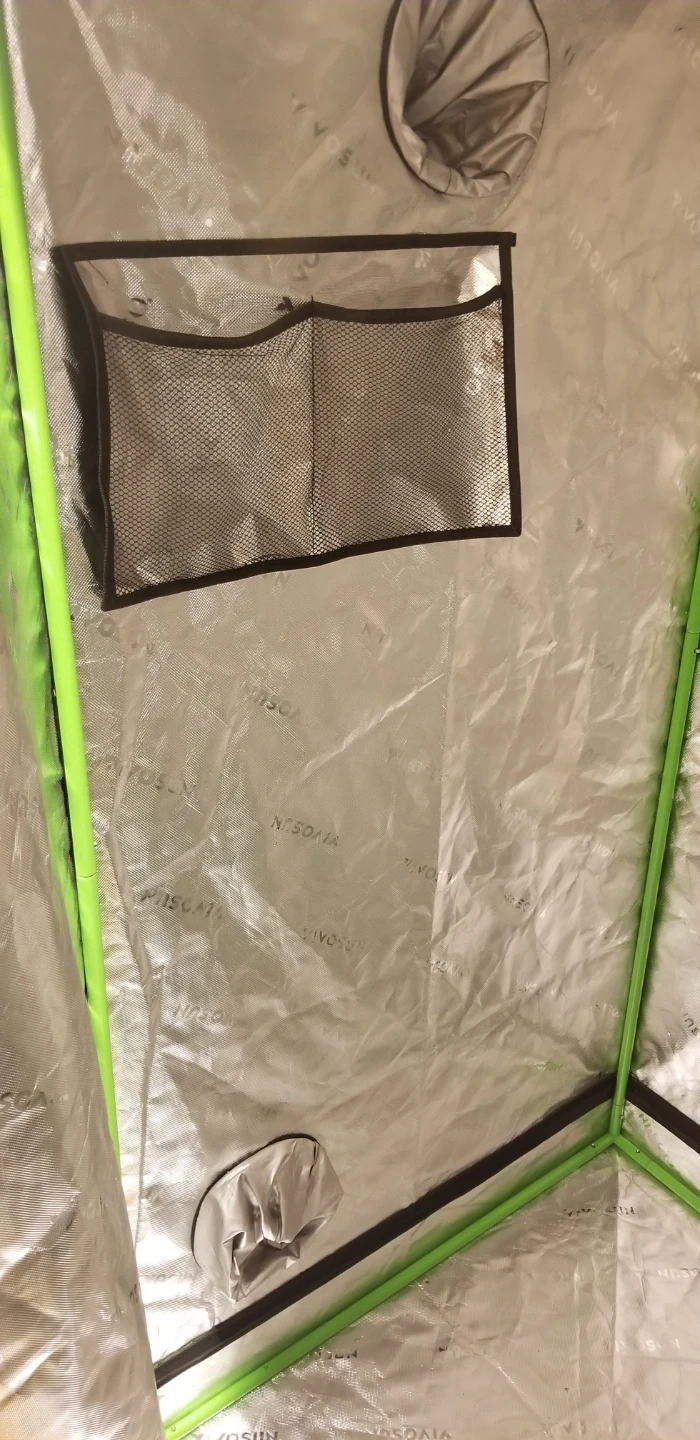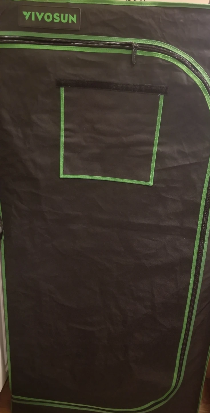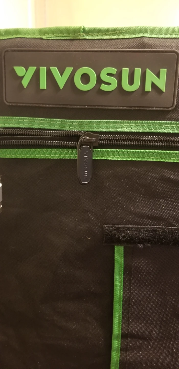 This is a VIVOSUN grow tent. It's made of durable black fabric with green trim. Includes vents and zippers for easy access. Some minor damage present on the exterior.