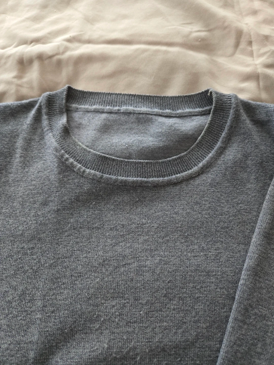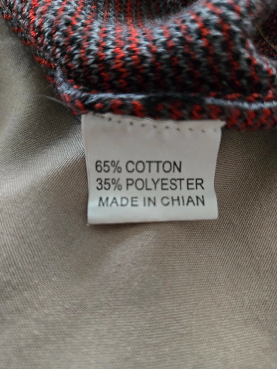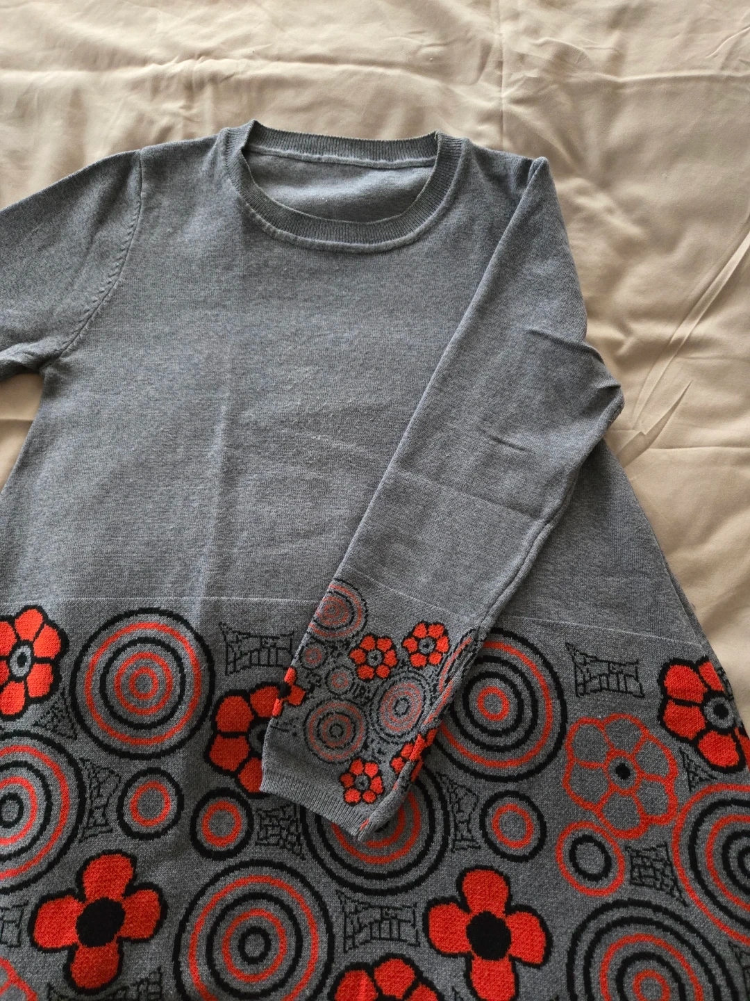 Grey long-sleeved sweater A-Line dress. It features a colourful floral and circle pattern at the hem and on the sleeves. Made from 65% cotton and 35% polyester. This dress is suitable for cooler weather. Knee-length. Size M.