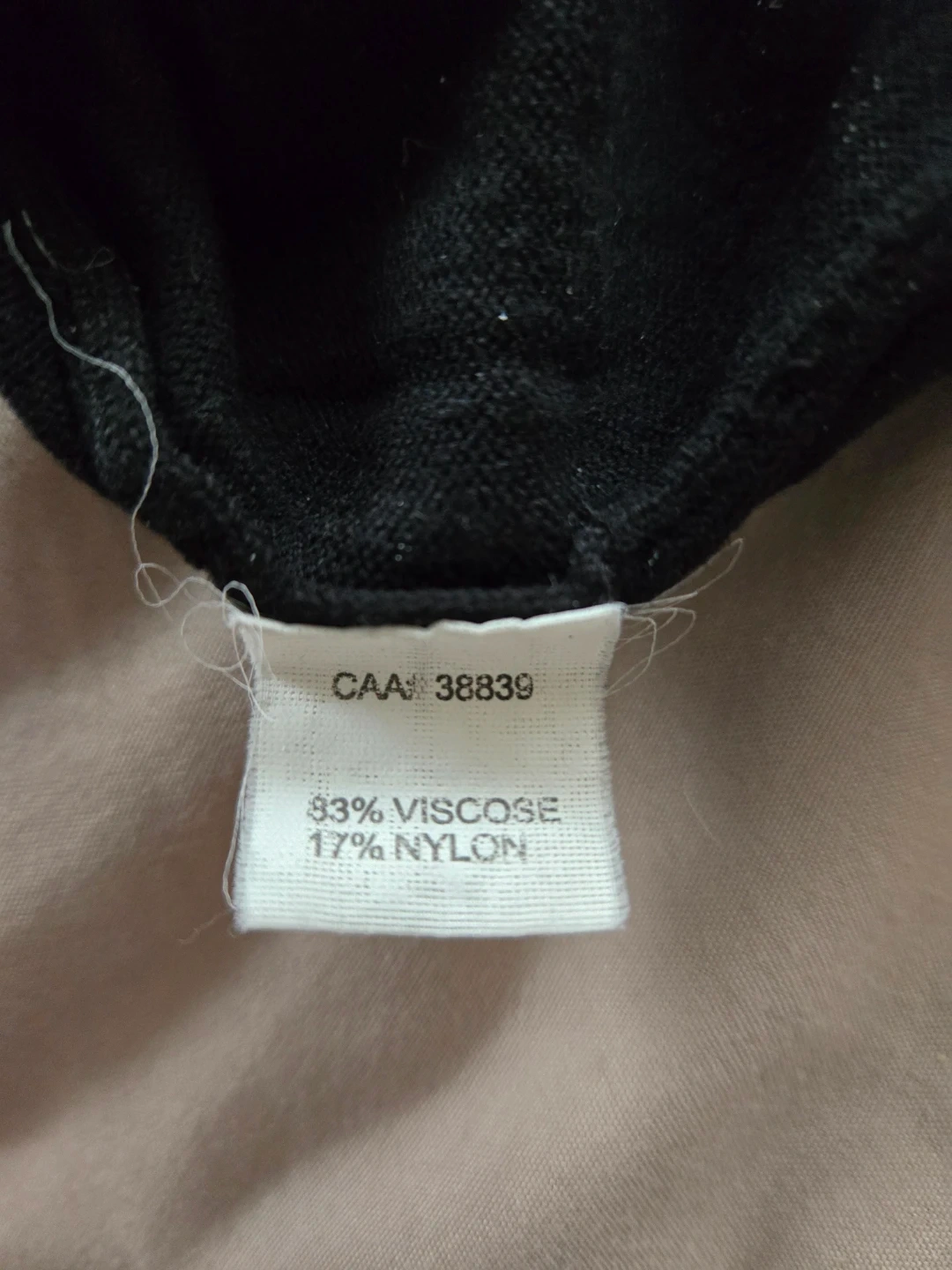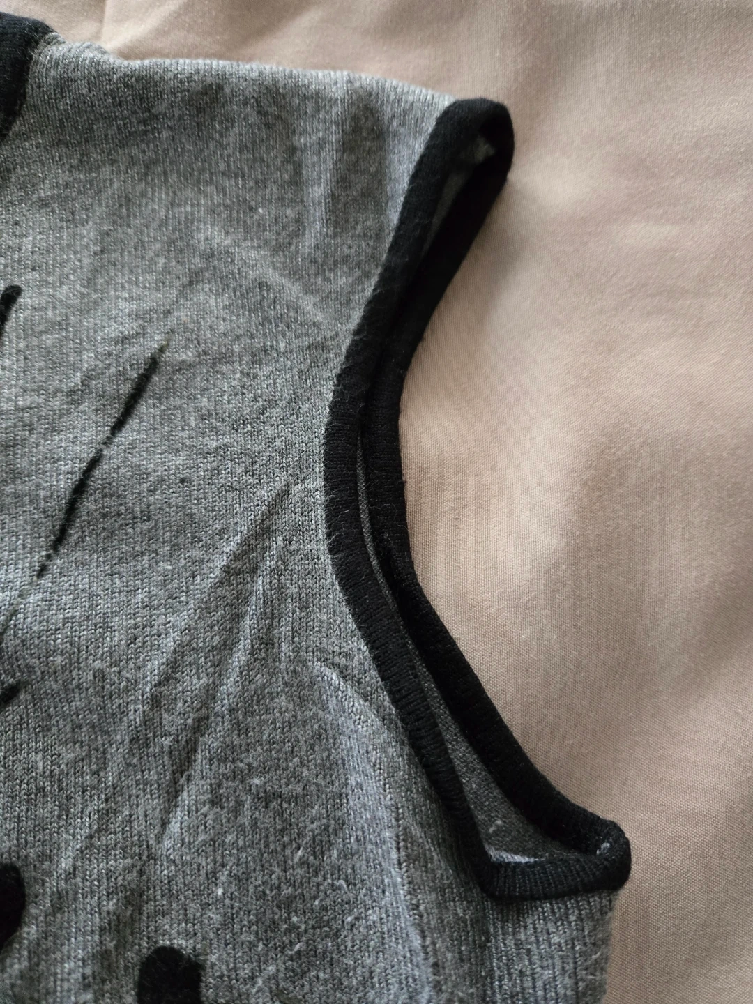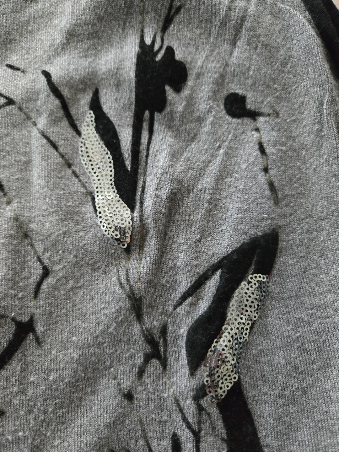 Grey and black sleeveless knit dress with a graphic print and sequins. It's made of 83% viscose and 17% nylon. Size medium.
