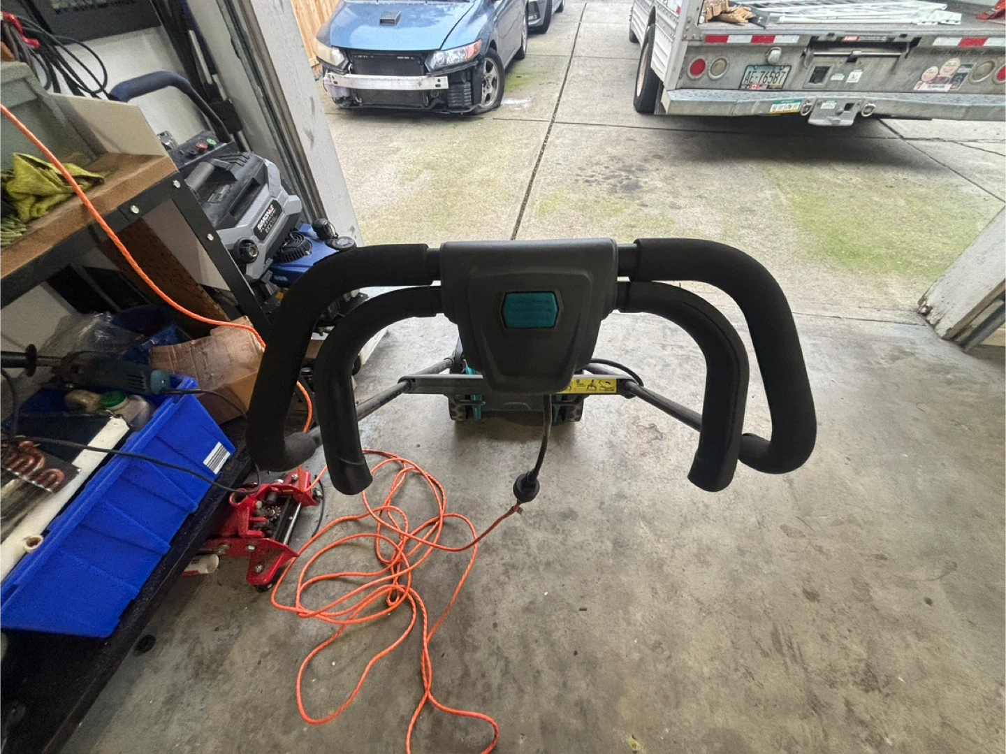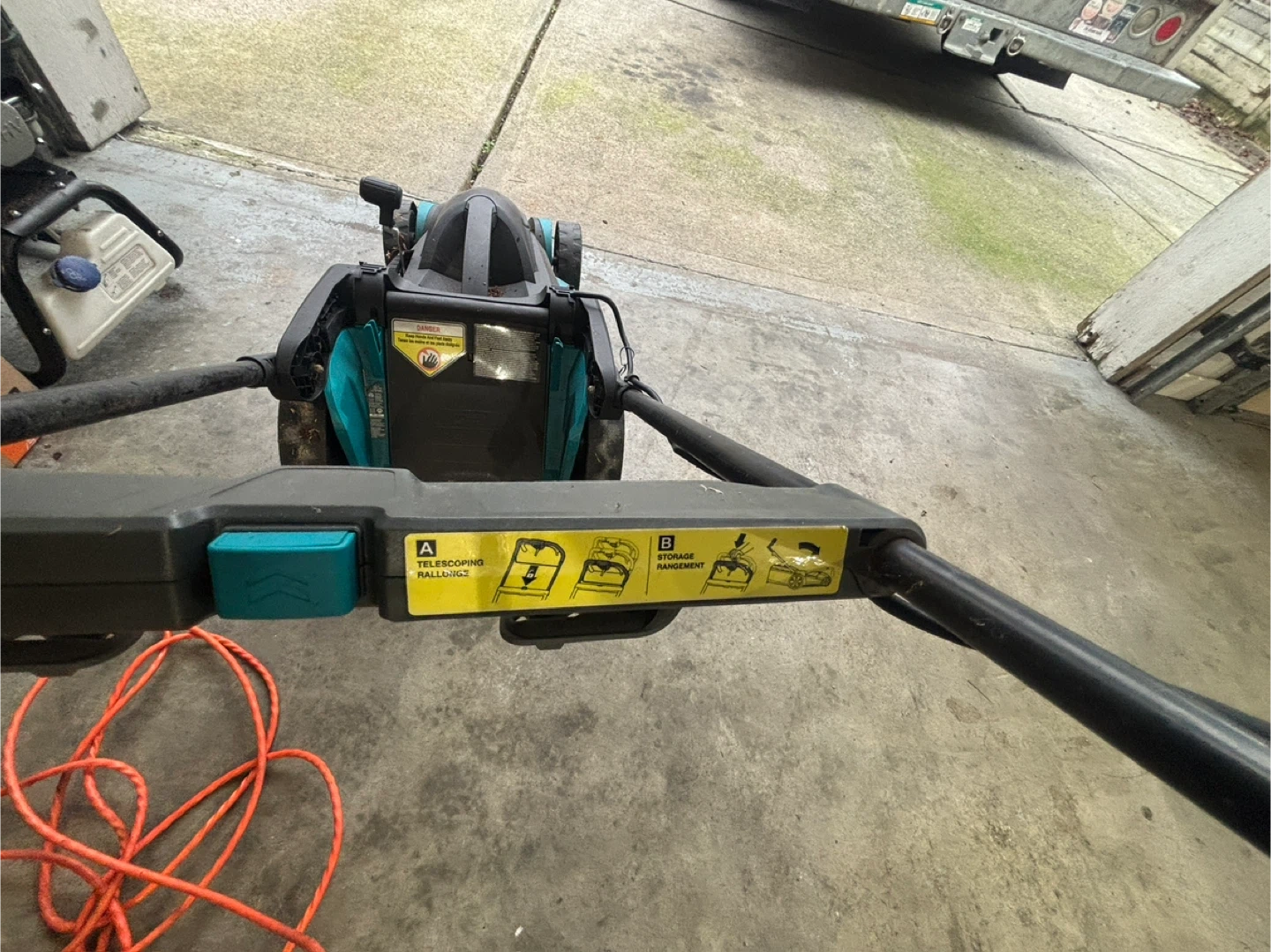 This is a teal and black Bosch electric lawn mower. It comes with a cord for operation. It's designed for easy grass cutting. Good condition we upgraded to gas so no need for this one
