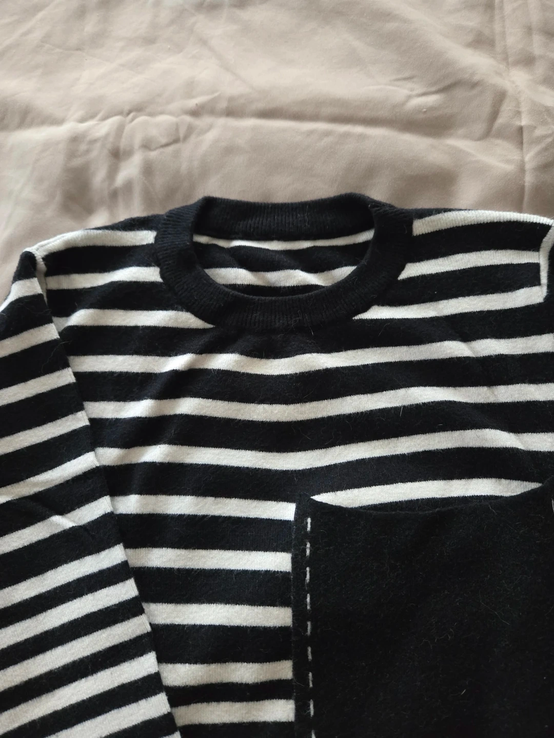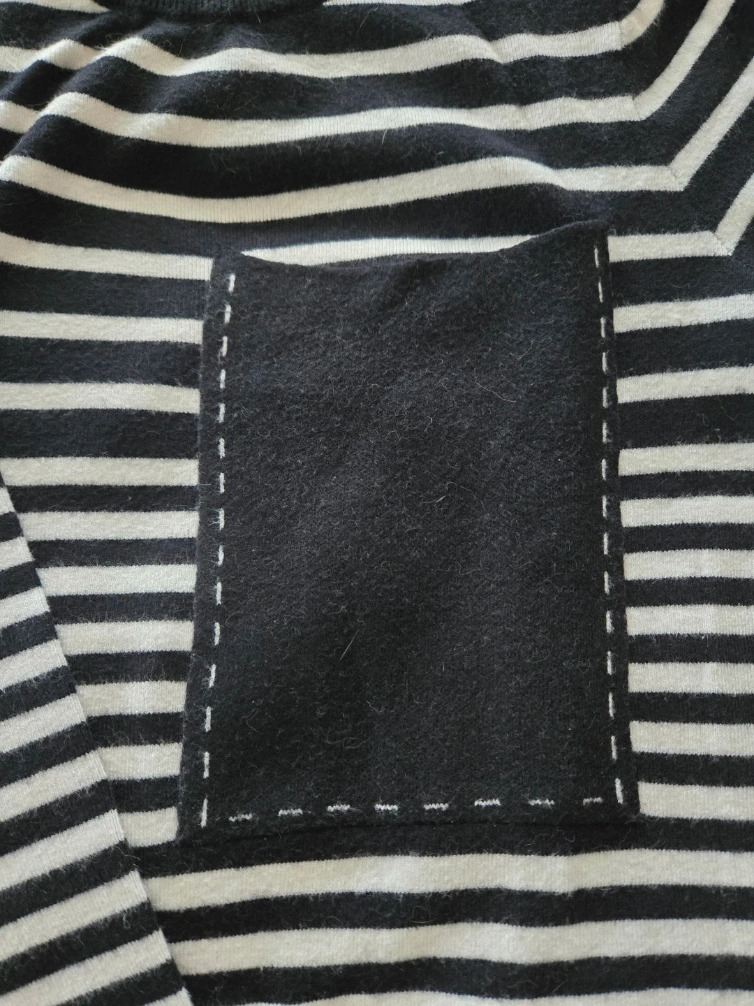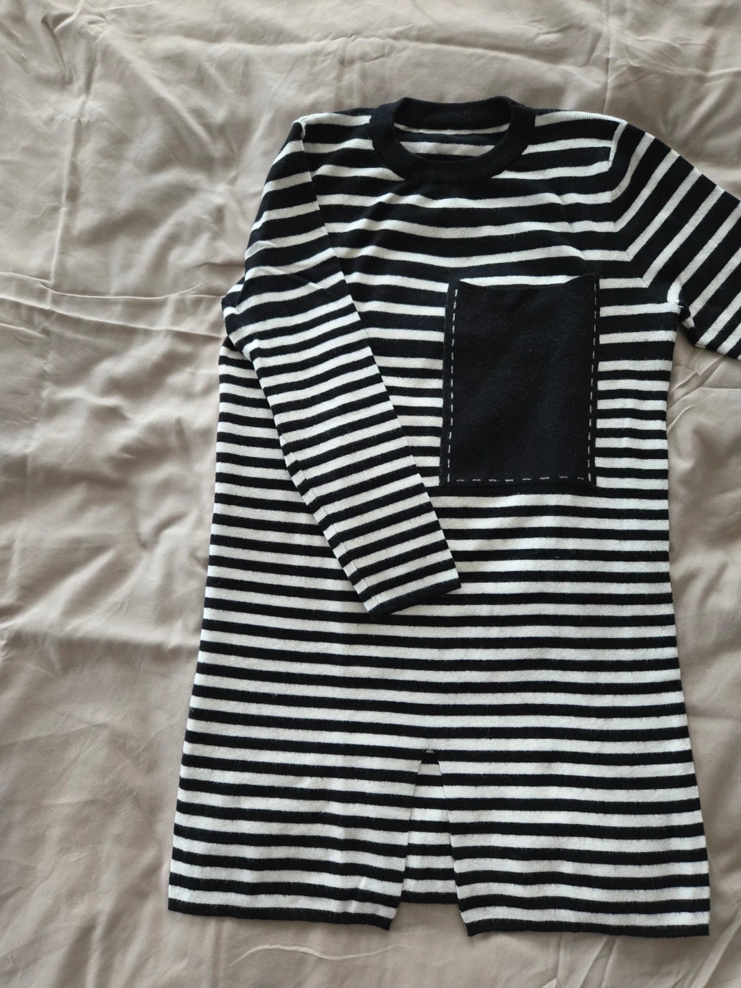A black and white striped long-sleeve knit tube dress. It has a front chest pocket with stitched detailing. There's a slit at the hem for ease of movement. Above-knee length.