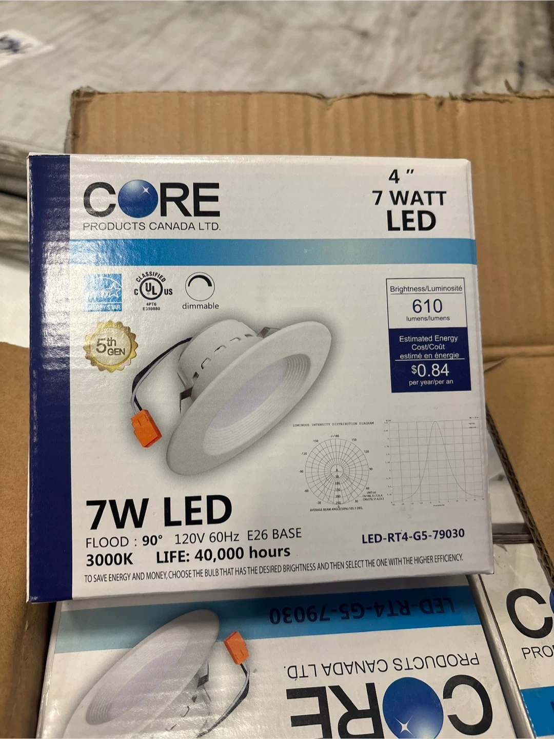CORE Products Canada 7W LED downlight. Dimmable. 90° flood beam angle. 40,000 hours of life. Comes with original packaging. All brand new in packaging, have 236 boxes $15 each, I can do a package deal if you buy more then 5, and I have one high bay commercial light(pm me for price, 4 spot lights ($40 each)