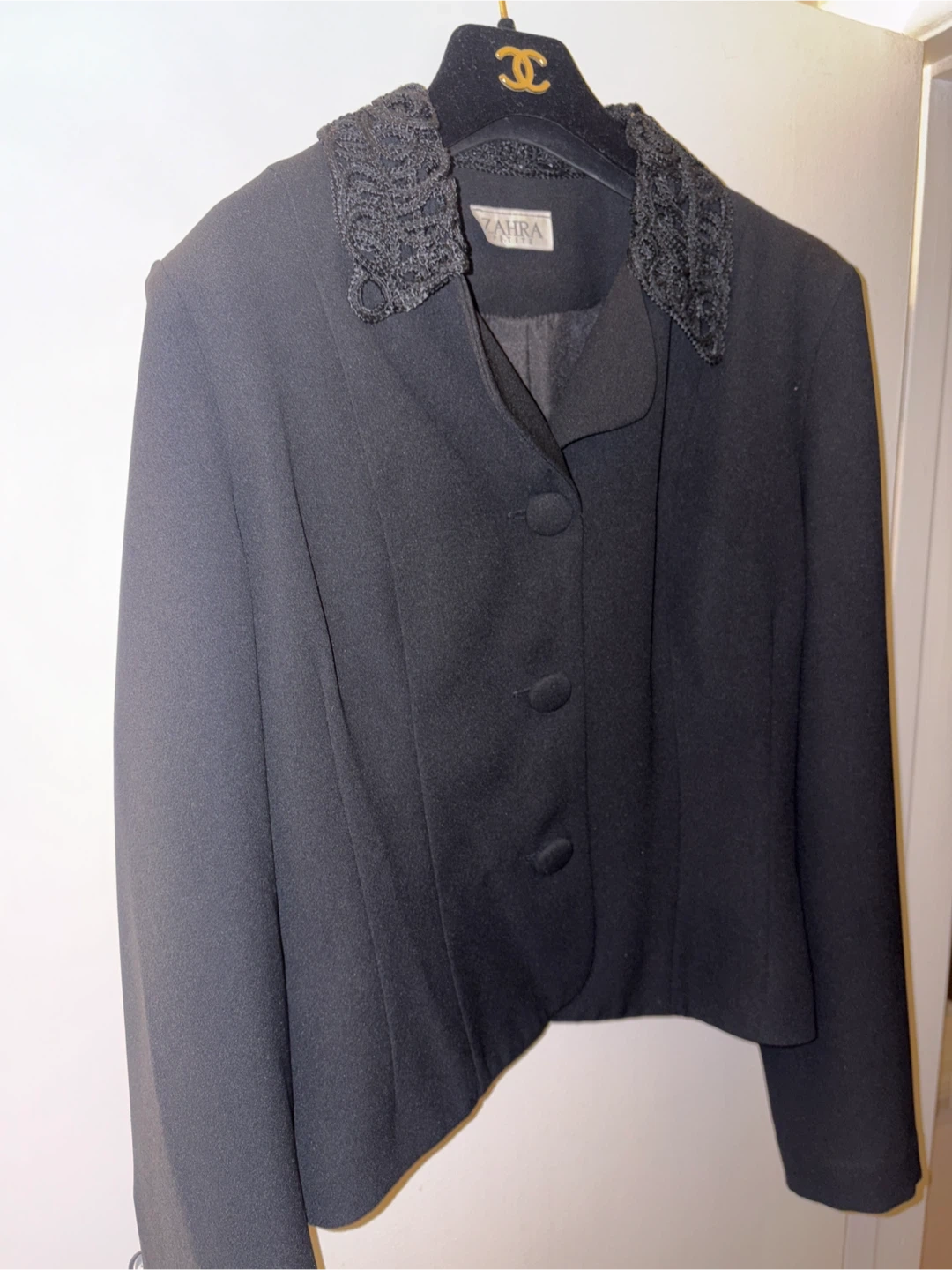 A stylish vintage Zahra blazer in black. Features a textured crochet collar detail. It has a button-up front closure. Perfect for adding a touch of elegance to any outfit!