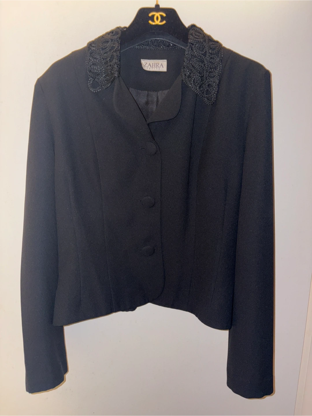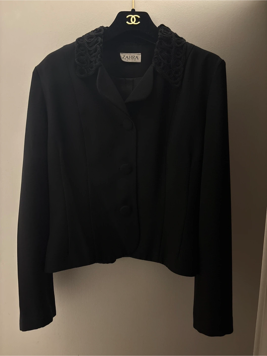 A stylish vintage Zahra blazer in black. Features a textured crochet collar detail. It has a button-up front closure. Perfect for adding a touch of elegance to any outfit!