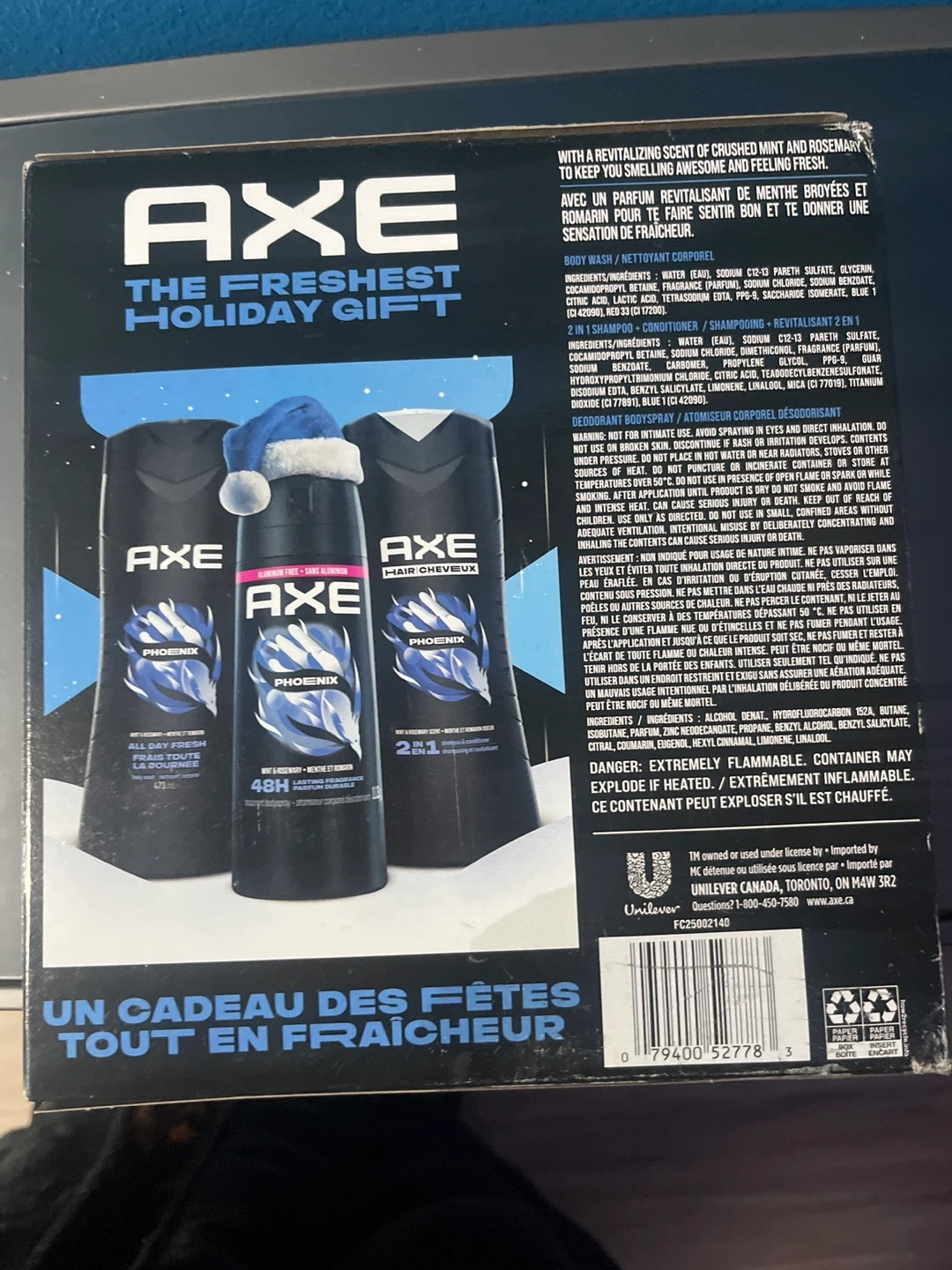 This Axe gift set includes body wash, deodorant body spray, and 2-in-1 shampoo + conditioner. All items are in the Phoenix scent. It's a great gift for anyone!