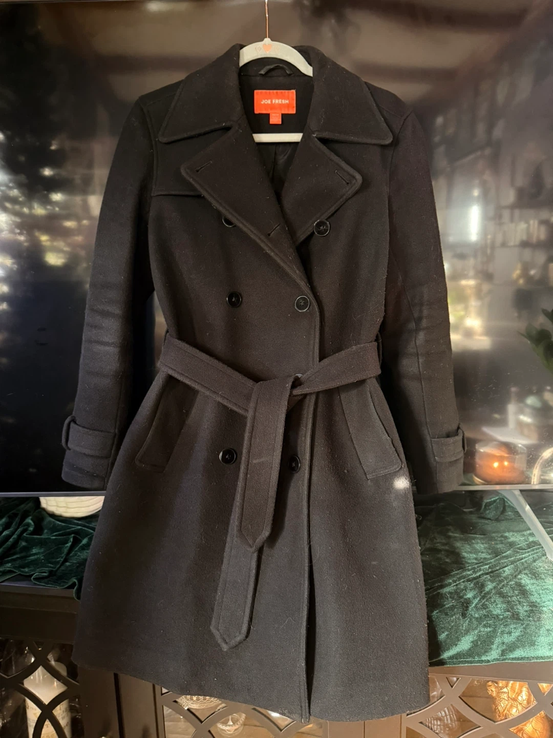 Joe Fresh black pea coat, size XS (fits much bigger). Features a belted waist and double-breasted closure. Perfect for transitional weather!