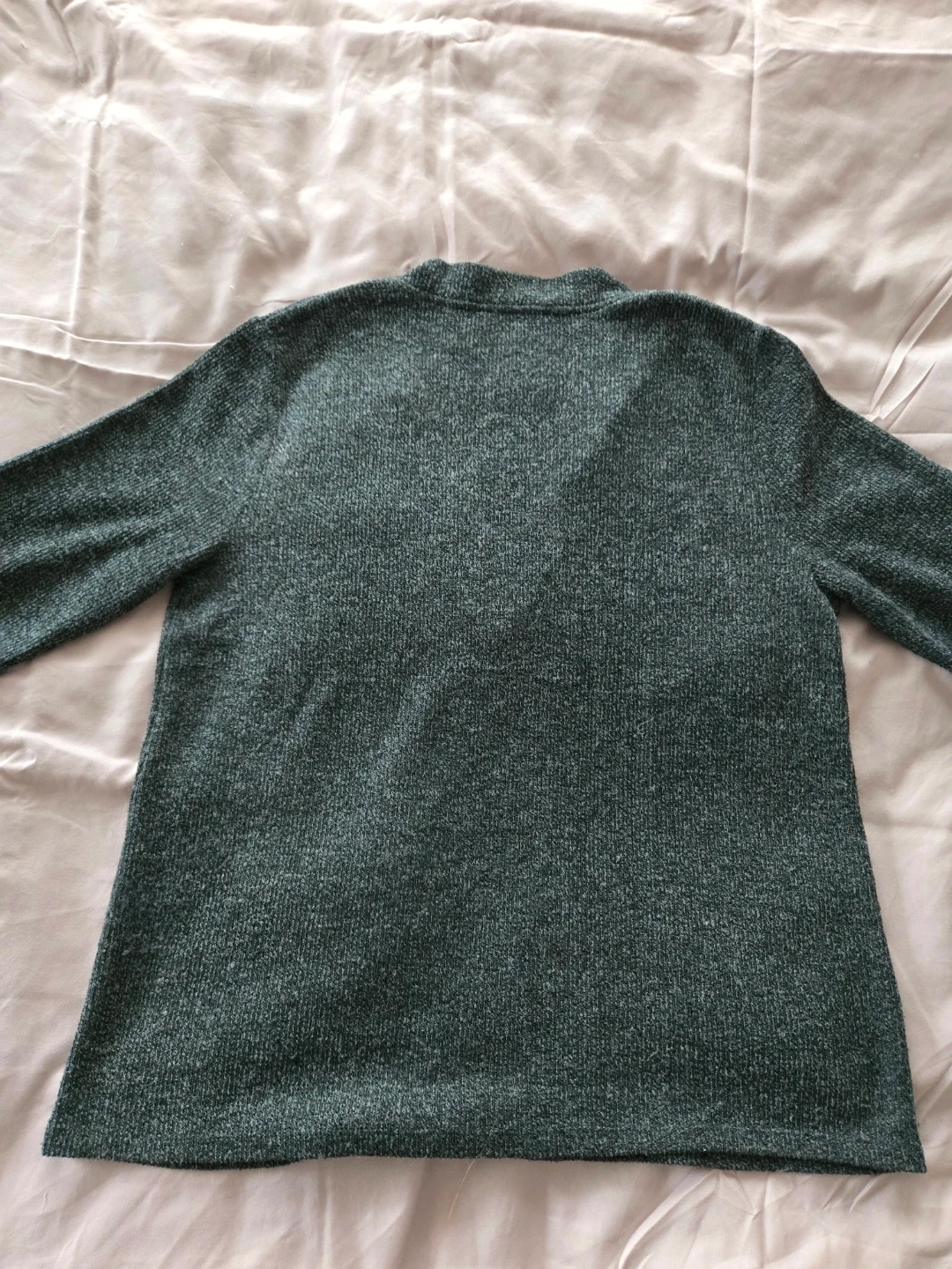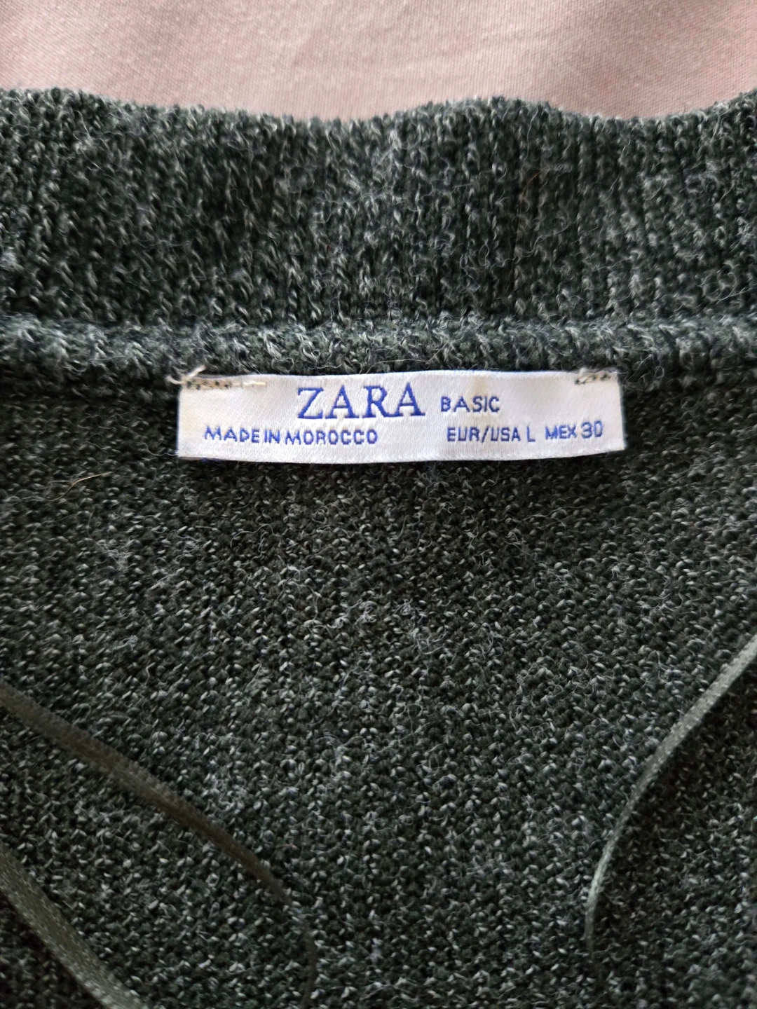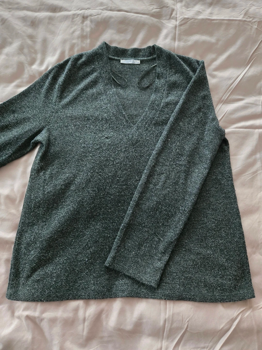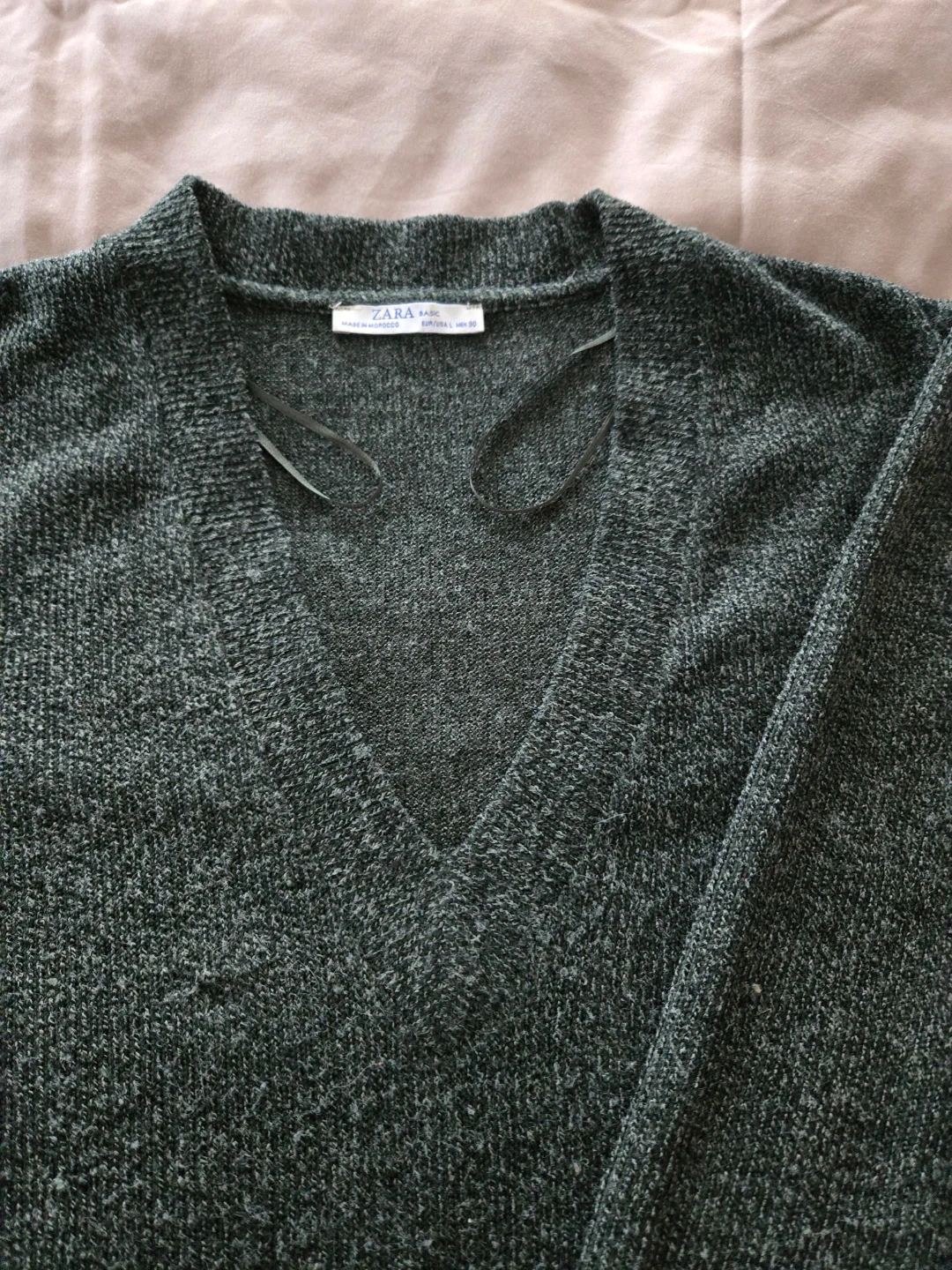 This is a Zara Basic V-neck sweater in a speckled grayish green colour. The knit is fine and it's made in Morocco. It's suitable for casual wear.