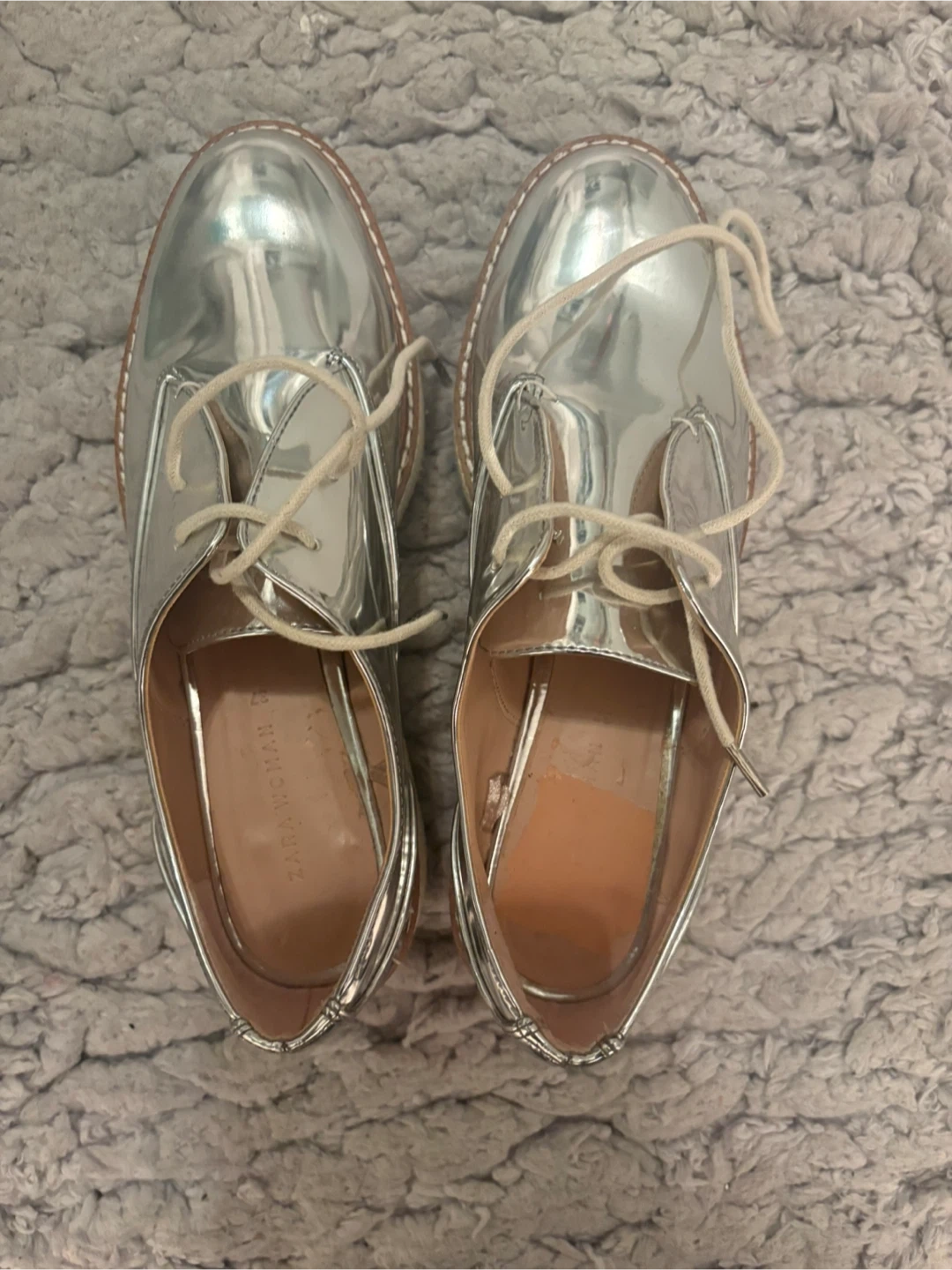 Silver shiny Oxford style shoes from Zara Woman. Features a platform sole and lace-up closure. These shoes are great for adding a pop of shine to any outfit!
