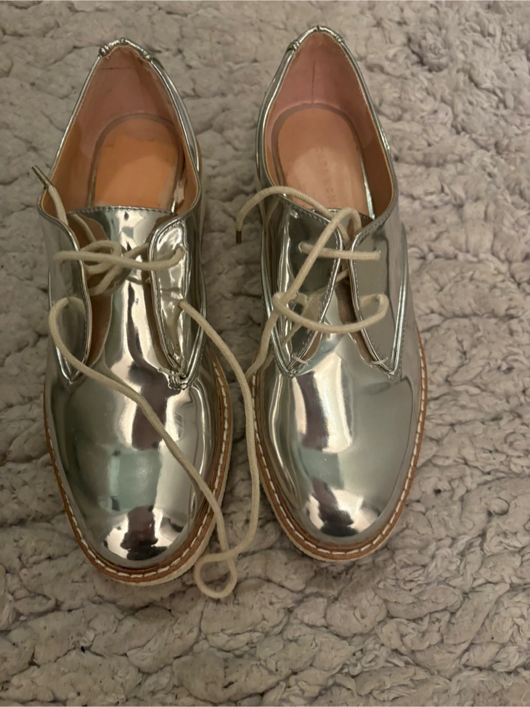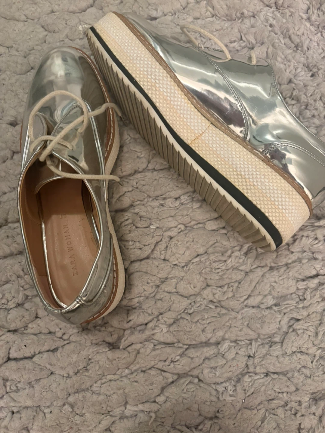 Silver shiny Oxford style shoes from Zara Woman. Features a platform sole and lace-up closure. These shoes are great for adding a pop of shine to any outfit!