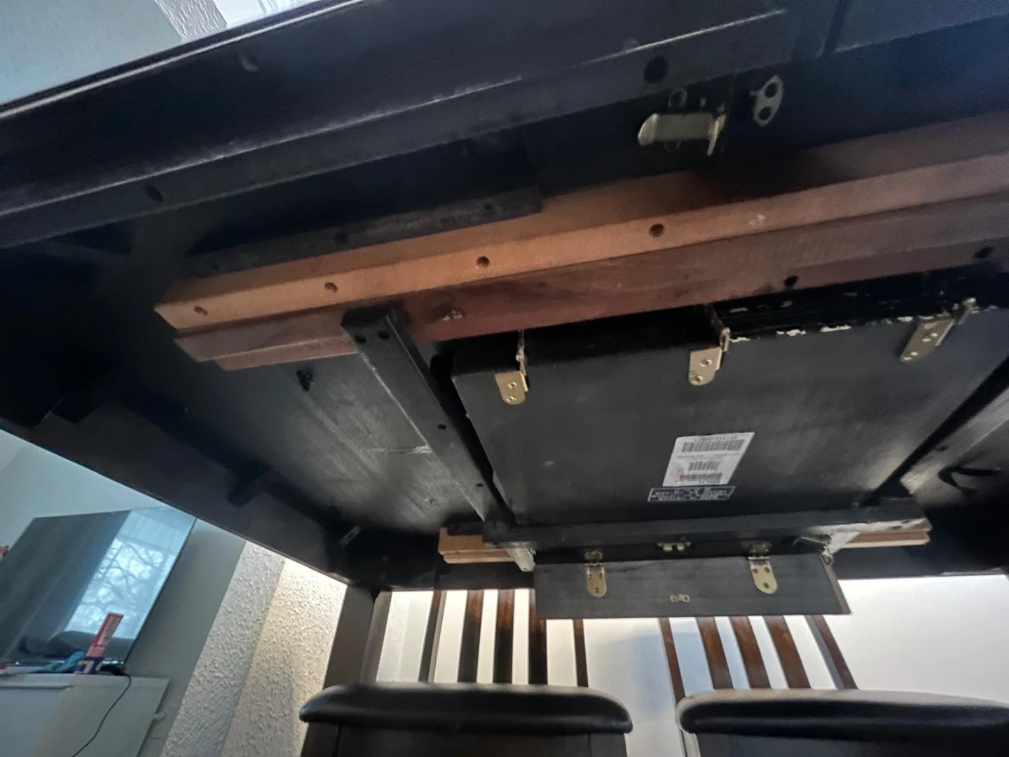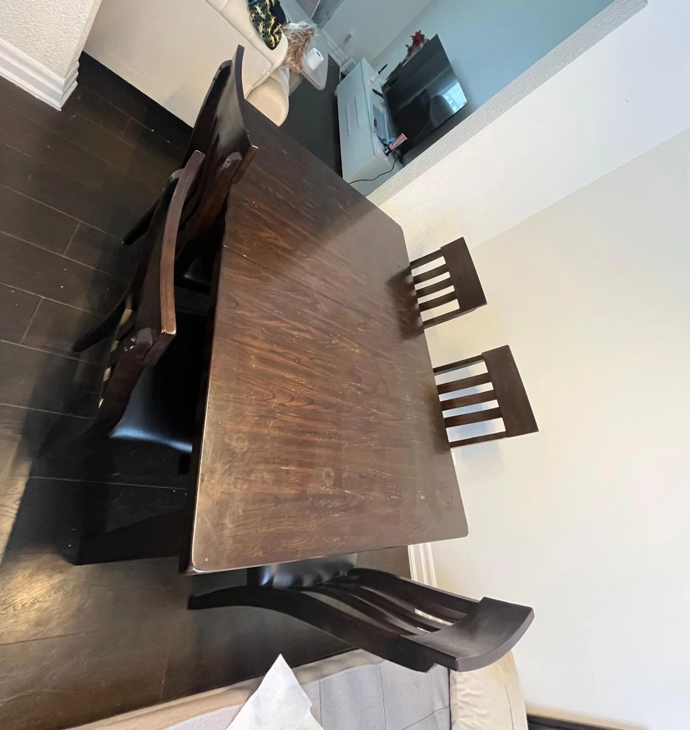 Solid Wood Dining table n chair with a dark brown finish and a comfortable padded seat. Bought from Ashley Store. Sturdy construction suitable for everyday use.Minor scratches on table.