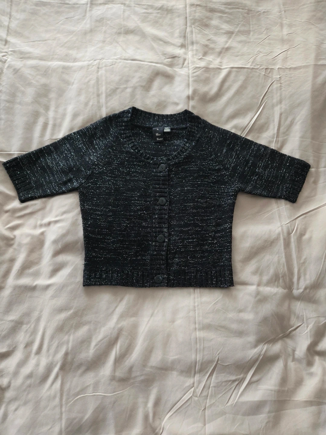 Le Classe Couture cardigan in black with a sparkle thread. Made of 100% acrylic. Features a button-up front and short sleeves. Size M/M.