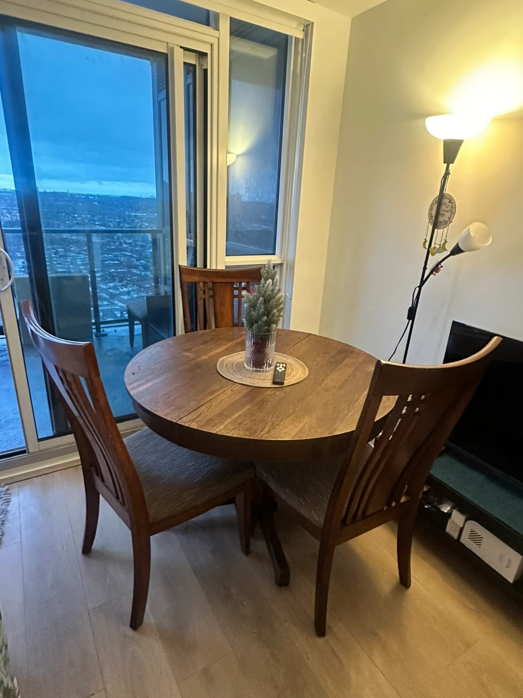 A round wood dining table with matching chairs. The chairs have upholstered seats and wooden frames. It's a nice set for a smaller dining area.