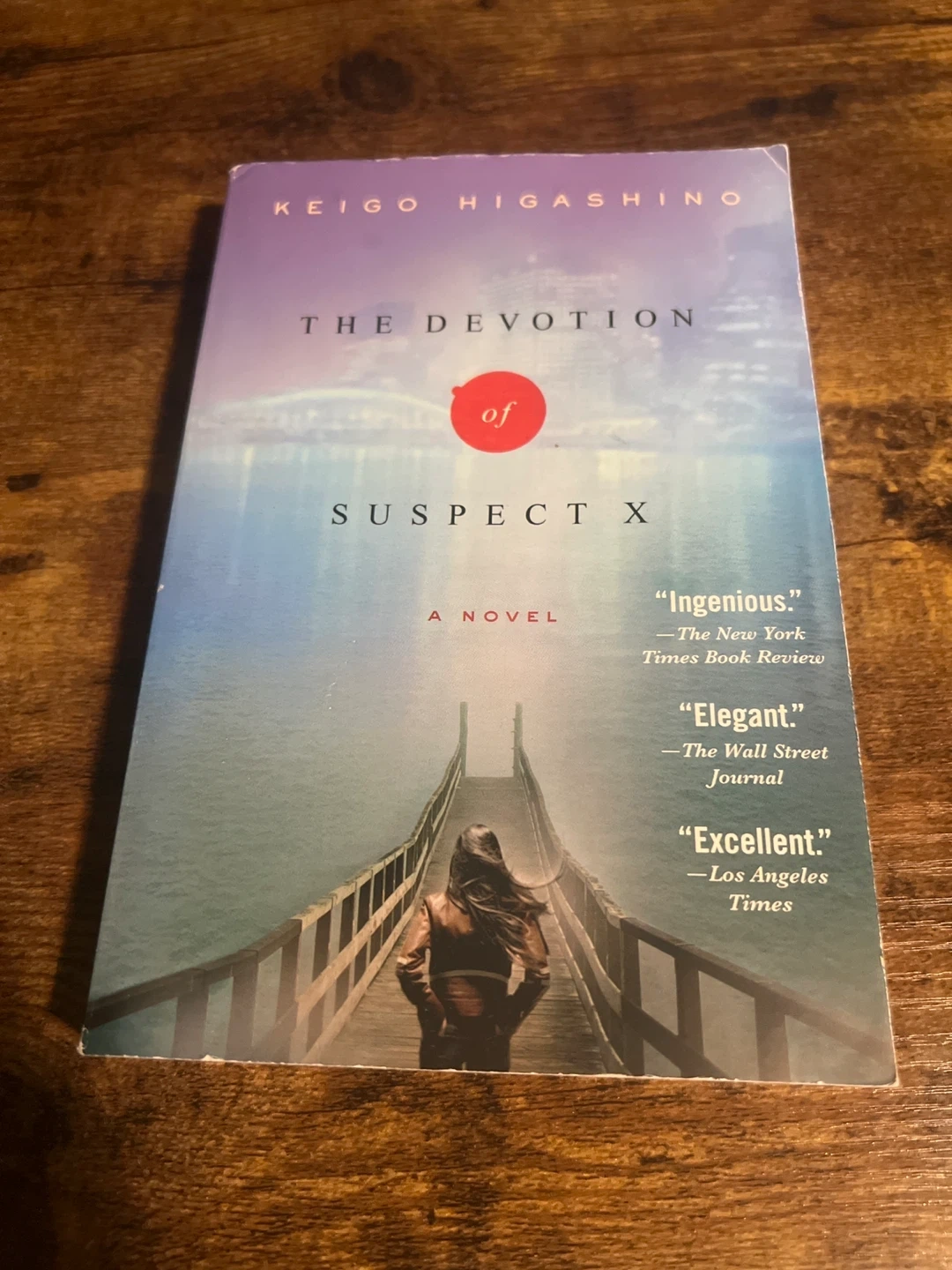 This is the novel 'The Devotion of Suspect X' by Keigo Higashino. It's a mystery thriller that has been praised by critics. The book offers an engaging plot and compelling characters for readers.