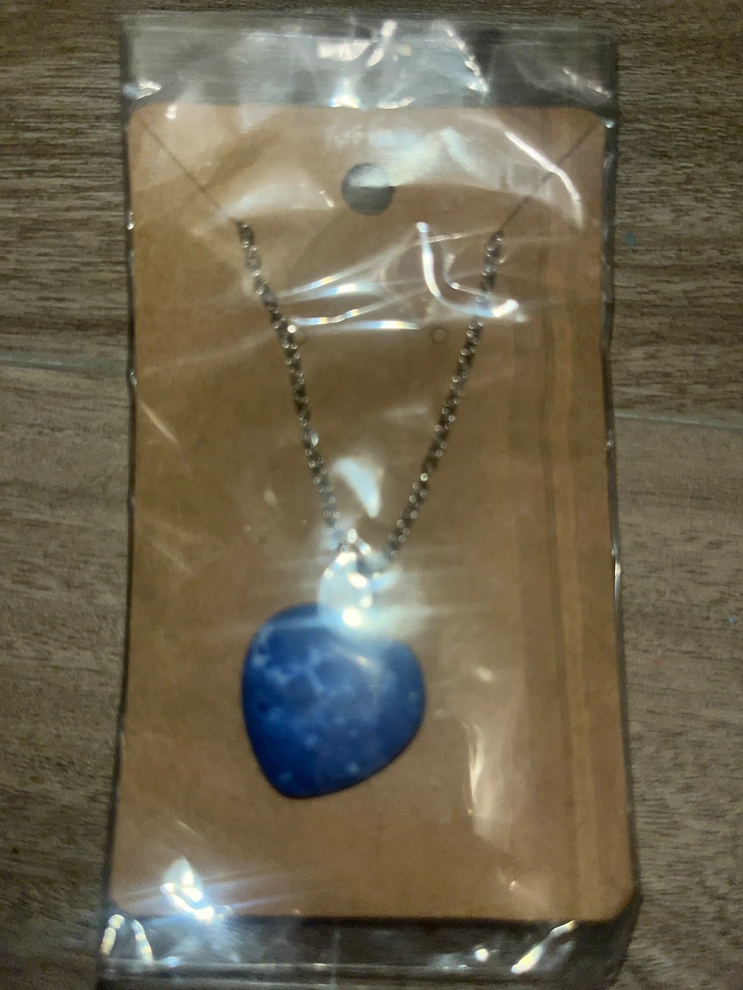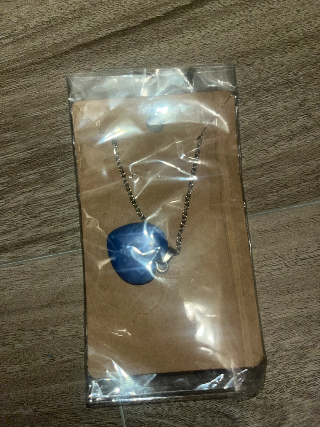 This is a heart pendant necklace with a blue stone. It comes on a silver-tone chain. This necklace is suitable for everyday wear.