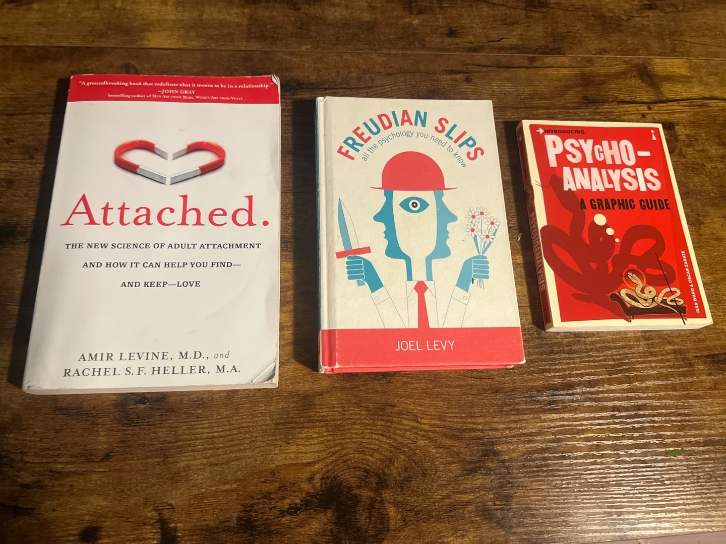 Three psychology books covering adult attachment, Freudian slips, and psychoanalysis. "Attached" by Amir Levine and Rachel Heller explores adult attachment. "Freudian Slips" by Joel Levy delves into psychology. "Introducing Psycho-Analysis" offers a graphic guide. These books are great for anyone interested in understanding human psychology.