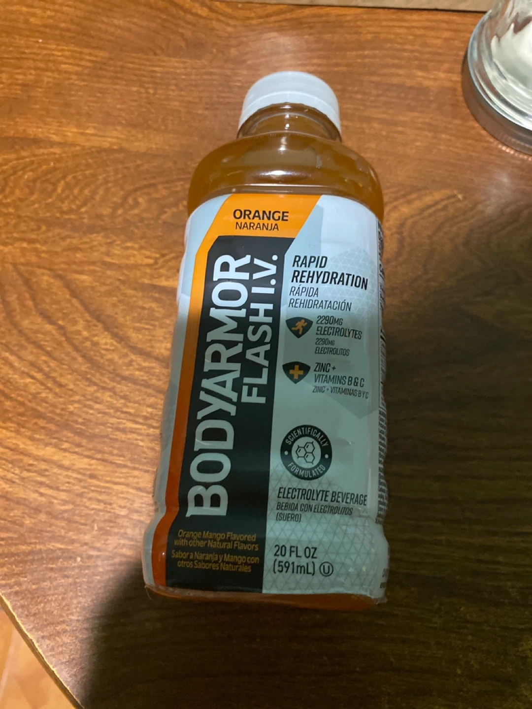 BODYARMOR FLASH I.V. Orange Mango flavored electrolyte beverage. This is a 20 fl oz (591mL) bottle. It contains 2290mg of electrolytes and is scientifically formulated with Zinc and Vitamins B & C. Great for rapid rehydration!