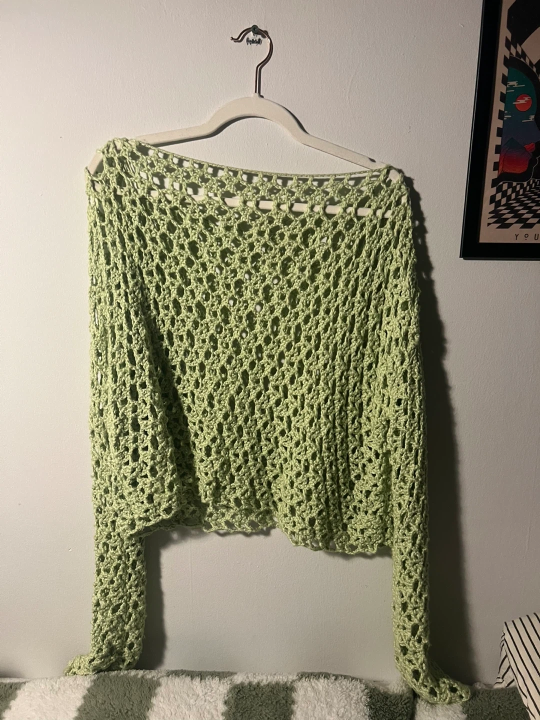 Light green, open-knit sweater with long sleeves. It's made of a soft yarn. This sweater's unique design is perfect for layering over a tank top or bikini.
